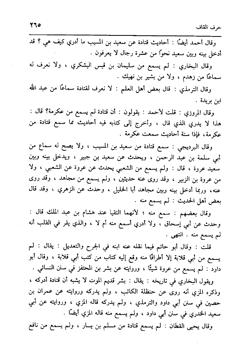 وَقَالَ البرديجي سمع قَتَادَة من سعيد بن الْمسيب وَلَا يَصح لَهُ سَماع من أبي سَلمَة بن عبد الرَّحْمَن وَيحدث عَن سعيد بن جُبَير وَيدخل بَينه وَبَين سعيد عُرْوَة قَالَ وَلم يسمع من الشّعبِيّ يحدث عَن عُرْوَة عَن الشّعبِيّ وَلَا من عُرْوَة بن الزبير وَقد روى عَنهُ حديثين وَلم يسمع من مُجَاهِد وَقد روى عَنهُ وَرُبمَا أَدخل بَينه وَبَين مُجَاهِد أَبَا الْخَلِيل وَحدث عَن الزُّهْرِيّ وَقد قَالَ بعض اهل الحَدِيث لم يسمع مِنْهُ