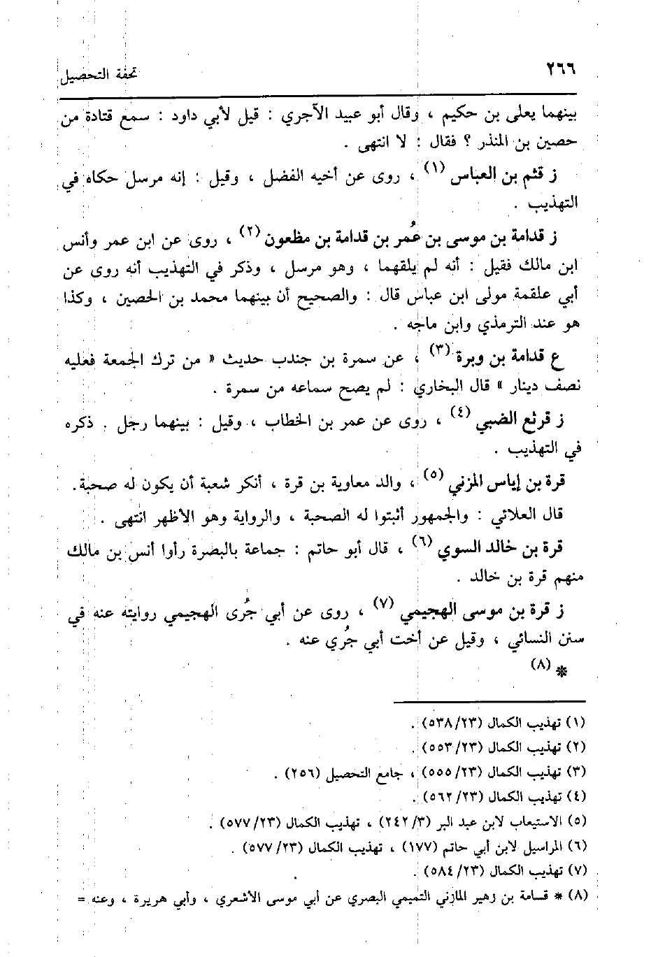 ز قدامَة بن مُوسَى بن عمر بن قدامَة بن مَظْعُون روى عَن ابْن عمر وَأنس ابْن مَالك فَقيل انه لم يلقهما وَهُوَ مُرْسل وَذكر فِي التَّهْذِيب أَنه روى عَن أبي عَلْقَمَة مولى ابْن عَبَّاس قَالَ وَالصَّحِيح ان بَينهمَا مُحَمَّد بن الْحصين وَكَذَا هُوَ عِنْد التِّرْمِذِيّ وَابْن مَاجَه