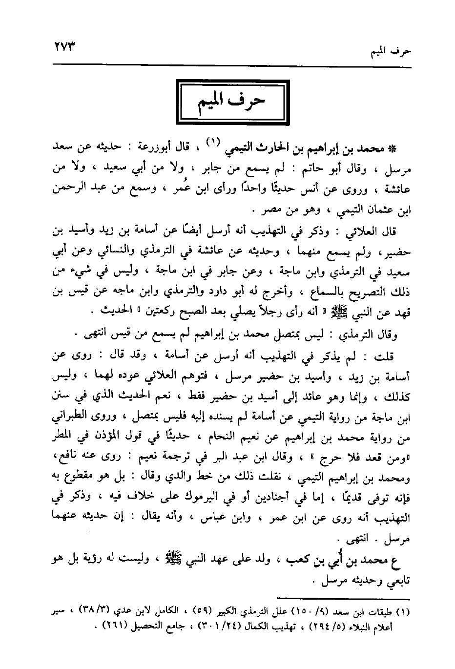 مُحَمَّد بن إِبْرَاهِيم بن الْحَارِث التَّيْمِيّ قَالَ أَبُو زرْعَة حَدِيثه عَن سعد مُرْسل وَقَالَ ابو حَاتِم لم يسمع من جَابر وَلَا من أبي سعيد وَلَا من عَائِشَة وروى عَن انس حَدِيثا وَاحِدًا وَرَأى ابْن عمر وَسمع من عبد الرَّحْمَن ابْن عُثْمَان التَّيْمِيّ وَهُوَ من مصر