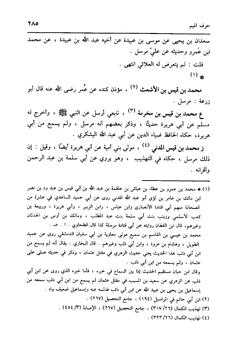 ع مُحَمَّد بن قيس بن مخرمَة تَابِعِيّ أرسل عَن النَّبِي صلى الله عَلَيْهِ وَسلم واخرج لَهُ مُسلم عَن أبي هُرَيْرَة حَدِيثا وَذكر بَعضهم انه مُرْسل وَلم يسمع من أبي هُرَيْرَة حَكَاهُ الْحَافِظ ضِيَاء الدّين عَن أبي عبد الله الْيَشْكُرِي