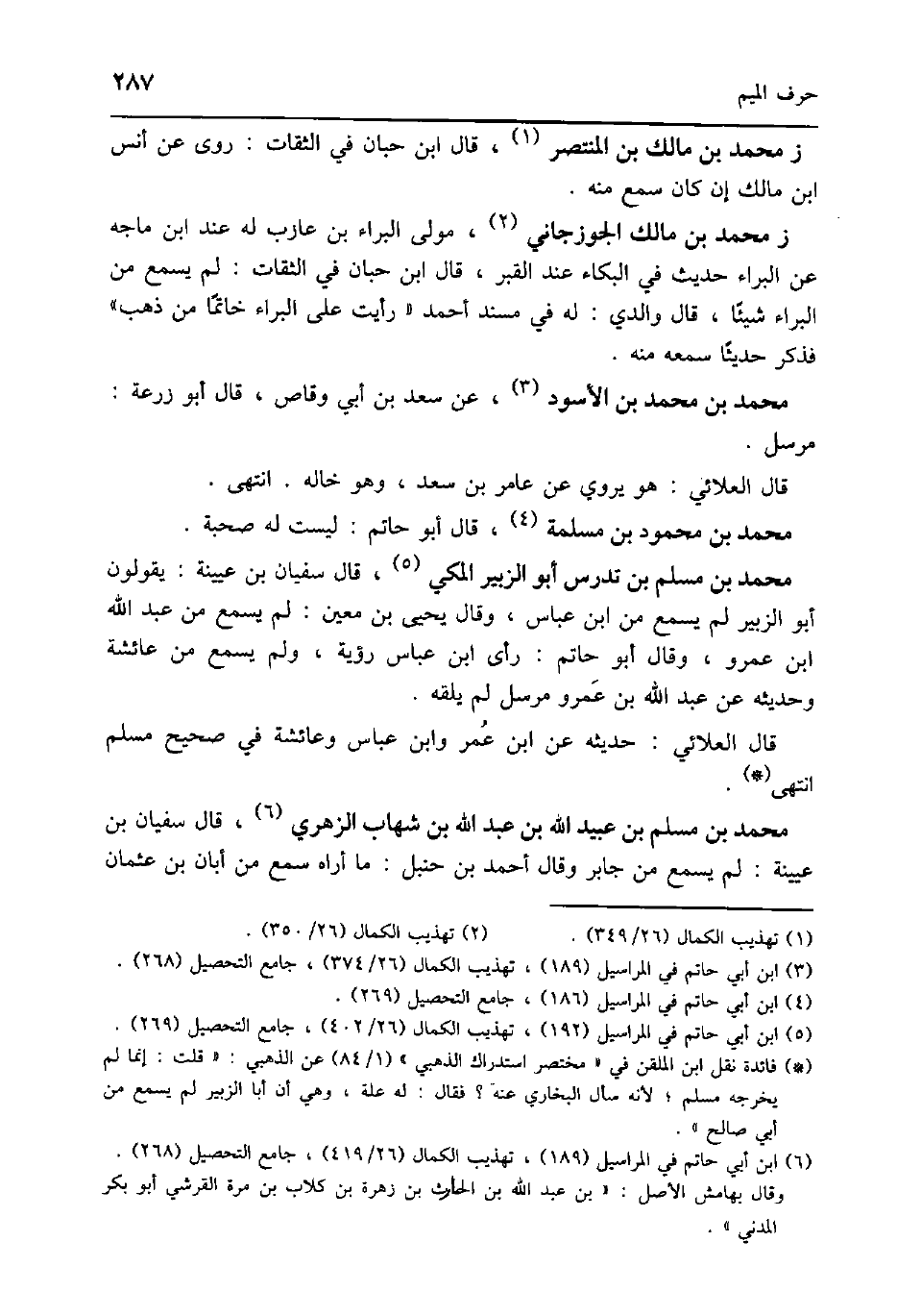 مُحَمَّد بن مُسلم بن تدرس أَبُو الزبير الْمَكِّيّ قَالَ سُفْيَان بن عُيَيْنَة يَقُولُونَ أَبُو الزبير لم يسمع من ابْن عَبَّاس وَقَالَ يحيى بن معِين لم يسمع من عبد الله ابْن عَمْرو وَقَالَ أَبُو حَاتِم رأى ابْن عَبَّاس رُؤْيَة وَلم يسمع من عَائِشَة وَحَدِيثه عَن عبد الله بن عَمْرو مُرْسل لم يلقه
