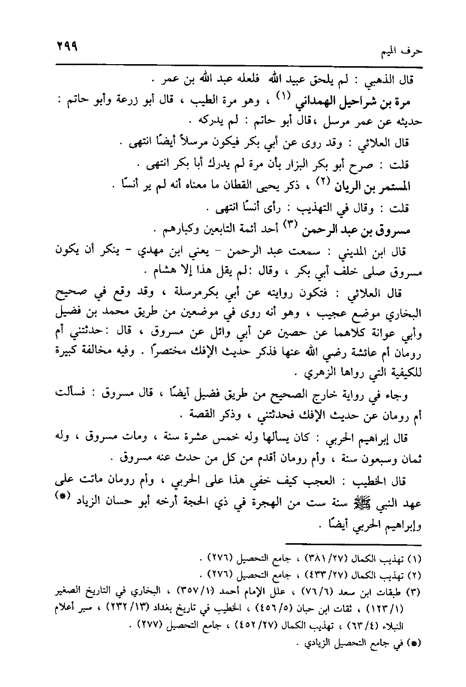 قَالَ العلائي فَتكون رِوَايَته عَن أبي بكر مُرْسلَة وَقد وَقع فِي صَحِيح البُخَارِيّ مَوضِع عَجِيب وَهُوَ انه روى فِي موضِعين من طَرِيق مُحَمَّد بن فُضَيْل وَأبي عوَانَة كِلَاهُمَا عَن حُصَيْن عَن أبي وَائِل عَن مَسْرُوق قَالَ حَدَّثتنِي ام رُومَان ام عَائِشَة رَضِي الله عَنْهَا فَذكر حَدِيث الْإِفْك مُخْتَصرا