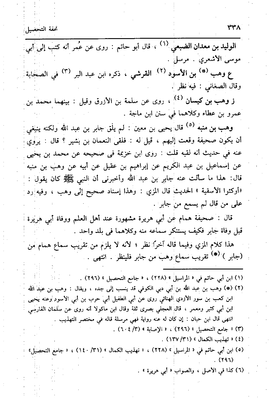 وهب بن مُنَبّه قَالَ يحيى بن معِين لم يلق جَابر بن عبد الله وَلكنه يَنْبَغِي أَن يكون صحيفَة وَقعت اليهم قيل لَهُ فلقى النُّعْمَان بن بشير قَالَ يروي عَنهُ فِي حَدِيث أَنه لقِيه قلت روى ابْن خُزَيْمَة فِي صَحِيحه عَن مُحَمَّد بن يحيى عَن إِسْمَاعِيل بن عبد الْكَرِيم عَن إِبْرَاهِيم بن عقيل عَن أَبِيه عَن وهب بن مُنَبّه قَالَ هَذَا مَا سَأَلت عَنهُ جَابر بن عبد الله وَأَخْبرنِي ان النَّبِي صلى الله عَلَيْهِ وَسلم كَانَ يَقُول (أوكئوا الأسقية) الحَدِيث قَالَ الْمزي وَهَذَا إِسْنَاد صَحِيح الى وهب وَفِيه رد على من قَالَ لم يسمع من جَابر