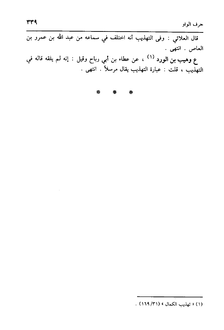 قَالَ العلائي وَفِي التَّهْذِيب أَنه اخْتلف فِي سَمَاعه من عبد الله بن عَمْرو بن الْعَاصِ