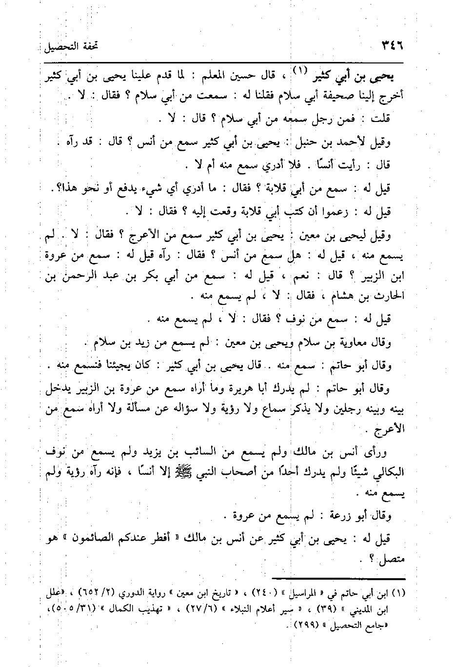 يحيى بن أبي كثير قَالَ حُسَيْن الْمعلم لما قدم علينا يحيى بن أبي كثير أخرج الينا صحيفَة أبي سَلام فَقُلْنَا لَهُ سَمِعت من أبي سَلام فَقَالَ لَا