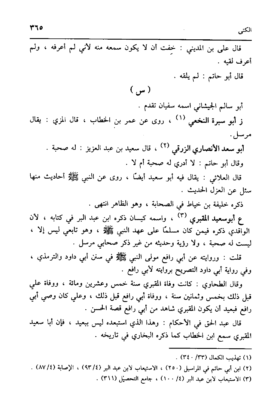 ع أَبُو سعيد المَقْبُري واسْمه كيسَان ذكره ابْن عبد الْبر فِي كِتَابه لِأَن الْوَاقِدِيّ ذكره فِيمَن كَانَ مُسلما على عهد النَّبِي صلى الله عَلَيْهِ وَسلم وَهُوَ تَابِعِيّ لَيْسَ الا لَيست لَهُ صُحْبَة وَلَا رُؤْيَة وَحَدِيثه من غير ذكر صَحَابِيّ مُرْسل