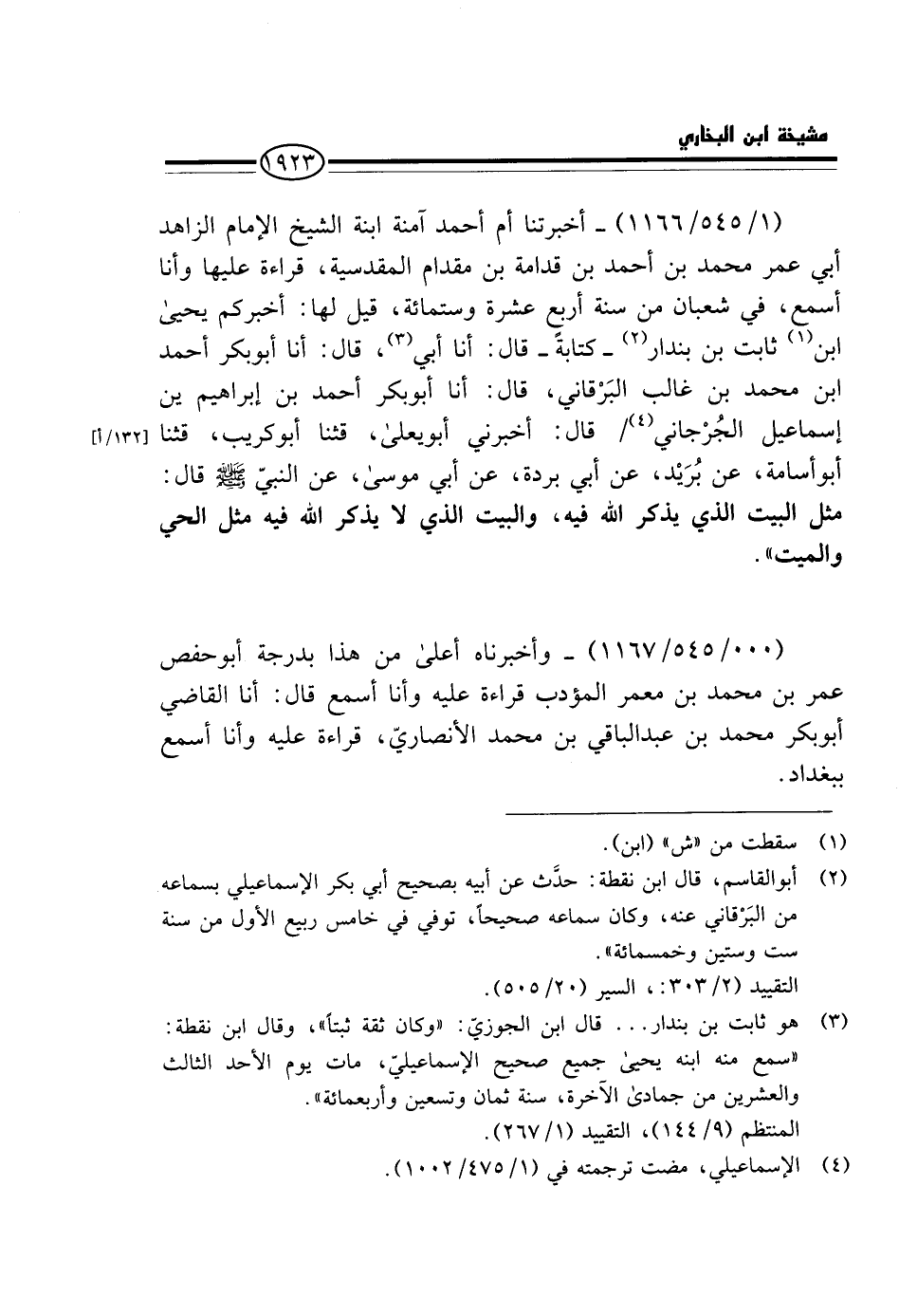 (1 / 545 / 1166) - أَخْبَرَتْنَا أُمُّ أَحْمَدَ آمِنَةُ ابْنَةُ الشَّيْخِ الْإِمَامِ الزَّاهِدِ أَبِي عُمَرَ مُحَمَّدِ بْنِ أَحْمَدَ بْنِ قُدَامَةَ بْنِ مِقْدَامٍ الْمَقْدِسِيَّةُ، قِرَاءَةً عَلَيْهَا وَأَنَا أَسْمَعُ، فِي شَعْبَانَ مِنْ سَنَةِ أَرْبَعَ عَشْرَةَ وسِتمِائَة، قيل لَهَا: أخْبركُم يحيى ابْن ثَابِتِ بْنِ بُنْدَارٍ - كِتَابَةً - قَالَ: أَنَا أَبِي، قَالَ: أَنا أَبُو بكر أَحْمد ابْن مُحَمَّدِ بْنِ غَالِبٍ الْبَرْقَانِيُّ، قَالَ: أَنَا أَبُو بَكْرٍ أَحْمَدُ بْنُ إِبْرَاهِيمَ بْنِ إِسْمَاعِيلَ الْجُرْجَانِيُّ / قَالَ: أَخْبَرَنِي أَبُو يَعْلَى، قَثَنَا أَبُو كُرَيْبٍ، قَثَنَا أَبُو أُسَامَةَ، عَنْ بُرَيْدٍ، عَنْ أَبِي بردة، عَن أبي مُوسَى، عَن النَّبِي - صَلَّى اللَّهُ عَلَيْهِ وَسَلَّم َ - قَالَ: مَثَلُ الْبَيْتِ الَّذِي يُذْكَرُ اللَّهُ فِيهِ، وَالْبَيْتِ الَّذِي لَا يُذْكَرُ اللَّهُ فِيهِ مَثَلُ الْحَيِّ وَالْمَيِّتِ ".