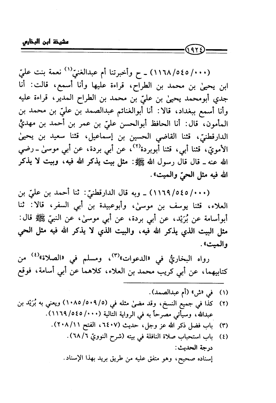 (000 / 545 / 1168) - ح وَأَخْبَرَتْنَا أُمُّ عَبْدِ الْغَنِيِّ نِعْمَةُ بِنْتُ عَليّ ابْن يَحْيَى بْنِ مُحَمَّدِ بْنِ الطَّرَّاحِ، قِرَاءَةً عَلَيْهَا وَأَنَا أَسْمَعُ، قَالَتْ: أَنَا جَدِّي أَبُو مُحَمَّدٍ يَحْيَى بْنُ عَلِيِّ بْنِ مُحَمَّدِ بْنِ الطَّرَّاح الْمُدِيرُ، قِرَاءَةً عَلَيْهِ وَأَنَا أَسْمَعُ بِبَغْدَادَ، قَالا: أَنَا أَبُو الْغَنَائِمِ عَبْدُ الصَّمَدِ بْنُ عَلِيِّ بْنِ مُحَمَّدِ بْنِ الْمَأْمُونِ، قَالَ: أَنَا الْحَافِظُ أَبُو الْحَسَنِ عَلِيُّ بْنُ عُمَرَ بْنِ أَحْمَدَ بْنِ مَهْدِيٍّ الدَّارَقُطْنِيُّ، قَثَنَا الْقَاضِي الْحُسَيْنُ بْنُ إِسْمَاعِيلَ، قَثَنَا سَعِيدُ بْنُ يَحْيَى الْأُمَوِيُّ، قَثَنَا أَبِي، قَثَنَا أَبُو بُرْدَةَ، عَنْ أَبِي بُرْدَةَ، عَنْ أَبِي مُوسَى - رَضِيَ اللَّهُ عَنْهُ - قَالَ قَالَ رَسُول الله - صَلَّى اللَّهُ عَلَيْهِ وَسَلَّم َ -: مَثَلُ بَيْتٍ يُذْكَرُ اللَّهُ فِيهِ، وَبَيْتٍ لَا يُذْكَرُ اللَّهُ فِيهِ مَثَلُ الْحَيِّ وَالْمَيِّتِ ".