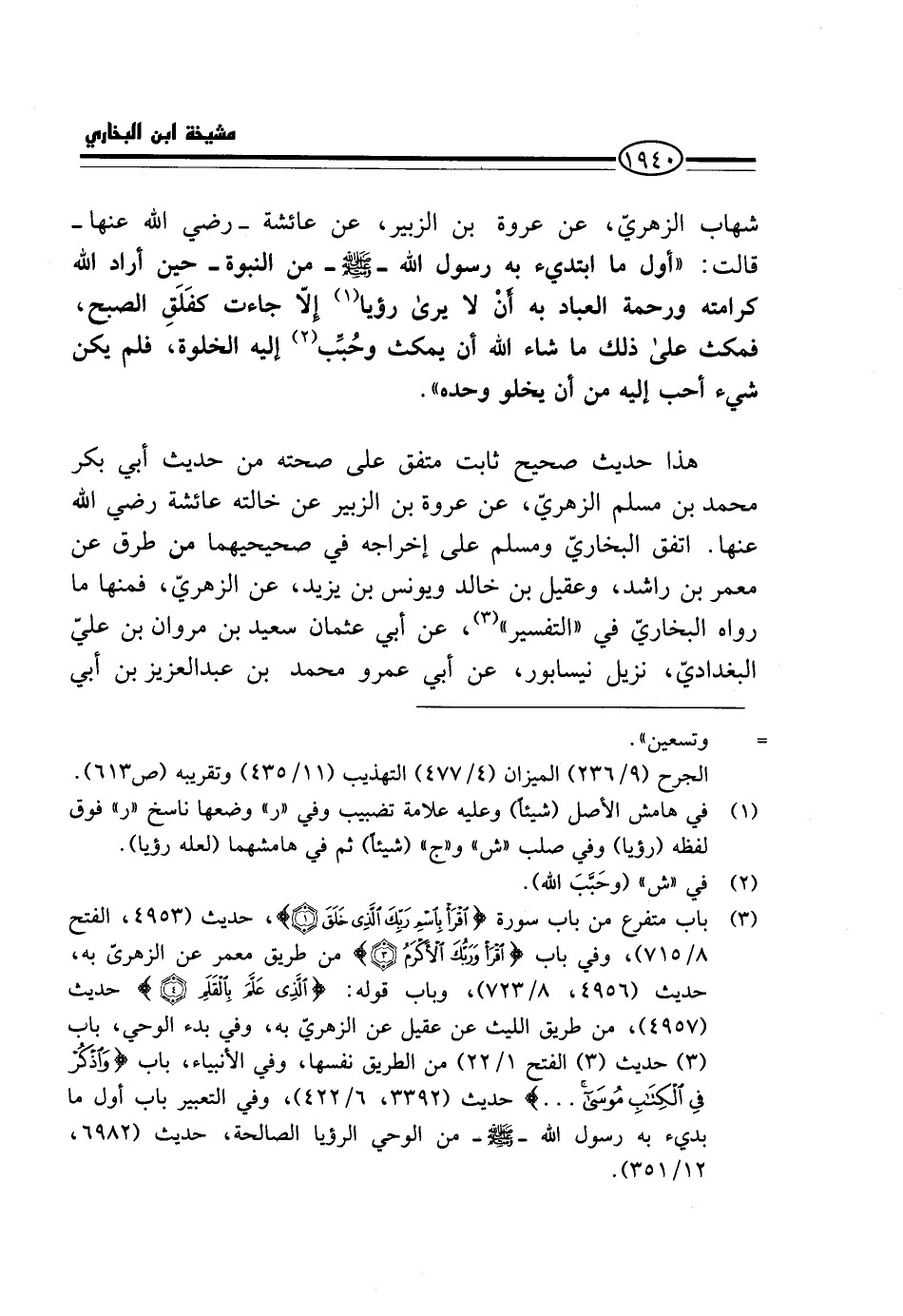 شِهَابٍ الزُّهْرِيُّ، عَنْ عُرْوَةَ بْنِ الزُّبَيْرِ، عَنْ عَائِشَةَ - رَضِيَ اللَّهُ عَنْهَا - قَالَتْ: " أَوَّلُ مَا ابتدئ بِهِ رَسُول الله - صَلَّى اللَّهُ عَلَيْهِ وَسَلَّم َ - مِنَ النُّبُوَّةِ - حِينَ أَرَادَ اللَّهُ كَرَامَتَهُ وَرَحْمَةَ الْعِبَادِ بِهِ أَنْ لَا يَرَى رُؤْيَا إِلَّا جَاءَتْ كَفَلَقِ الصُّبْحِ، فَمَكَثَ عَلَى ذَلِكَ مَا شَاءَ اللَّهُ أَنْ يَمْكُثَ وَحُبِّبَ إِلَيْهِ الْخَلْوَةُ، فَلَمْ يَكُنْ شَيْءٌ أَحَبَّ إِلَيْهِ مِنْ أَنْ يَخْلُوَ وَحْدَهُ ".