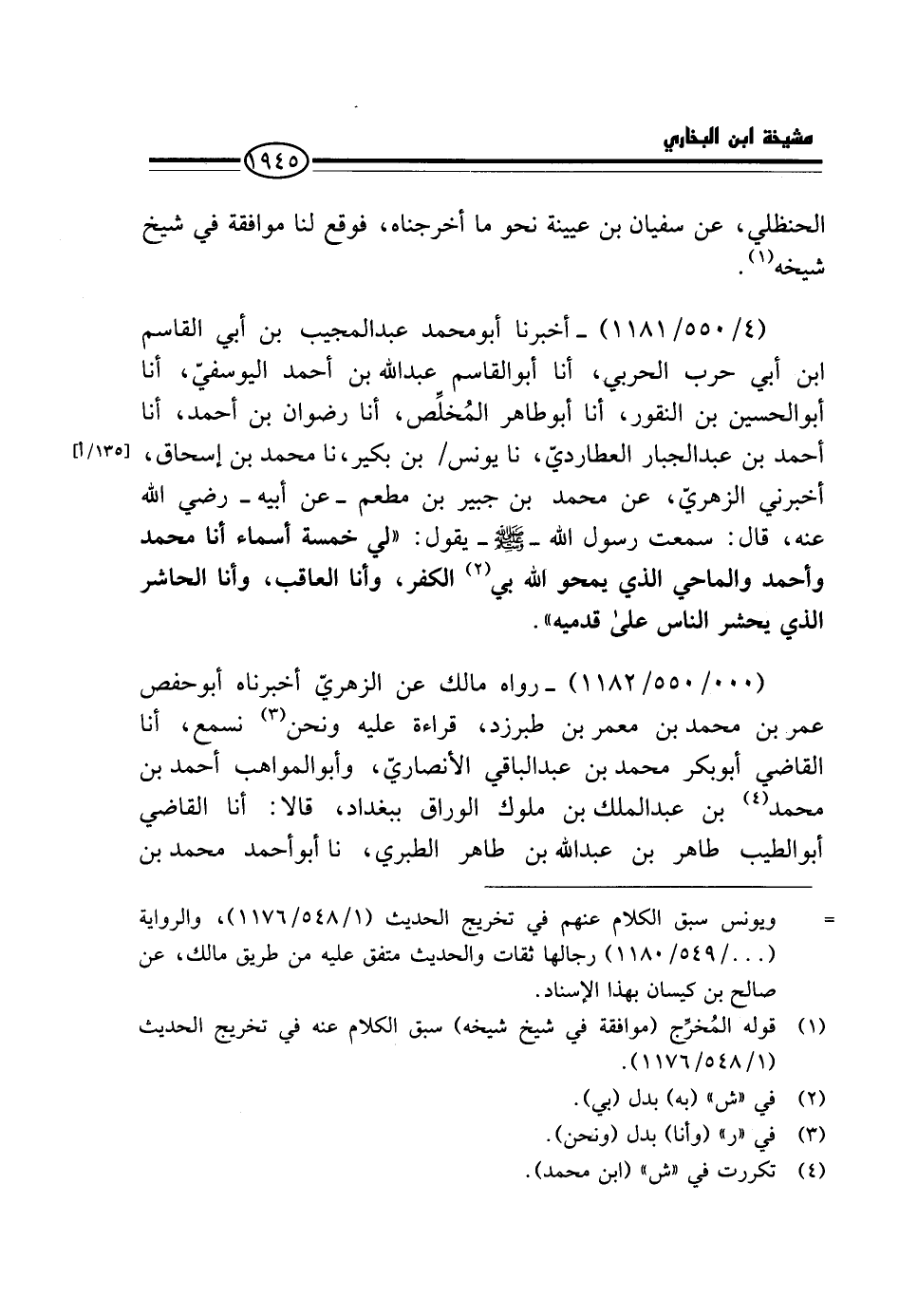 (4 / 550 / 1181) - أَخْبَرَنَا أَبُو مُحَمَّدٍ عَبْدُ الْمُجِيبِ بْنُ أَبِي الْقَاسِم ابْن أَبِي حَرْبٍ الْحَرْبِيُّ، أَنَا أَبُو الْقَاسِمِ عَبْدُ اللَّهِ بْنُ أَحْمَدَ الْيُوسُفِيُّ، أَنَا أَبُو الْحُسَيْنِ بْنُ النَّقُّورِ، أَنَا أَبُو طَاهِر الْمُخَلِّصُ، أَنَا رِضْوَانُ بْنُ أَحْمَدَ، أَنَا أَحْمَدُ بْنُ عَبْدِ الْجَبَّارِ الْعُطَارِدِيُّ، نَا يُونُسُ / بْنُ بُكَيْرٍ، نَا مُحَمَّدُ بْنُ إِسْحَاقَ، أَخْبَرَنِي الزُّهْرِيُّ، عَنْ مُحَمَّدِ بْنِ جُبَيْرِ بْنِ مُطْعِمٍ - عَنْ أَبِيهِ - رَضِيَ الله عَنهُ، قَالَ: سَمِعت رَسُول الله - صَلَّى اللَّهُ عَلَيْهِ وَسَلَّم َ - يَقُولُ: " لِي خَمْسَةُ أَسْمَاءٍ أَنَا مُحَمَّدٌ وَأَحْمَدُ وَالْمَاحِي الَّذِي يَمْحُو اللَّهُ بِيَ الْكُفْرَ، وَأَنَا الْعَاقِبُ، وَأَنَا الْحَاشِرُ الَّذِي يُحْشَرُ النَّاسُ عَلَى قَدَمَيْهِ ".