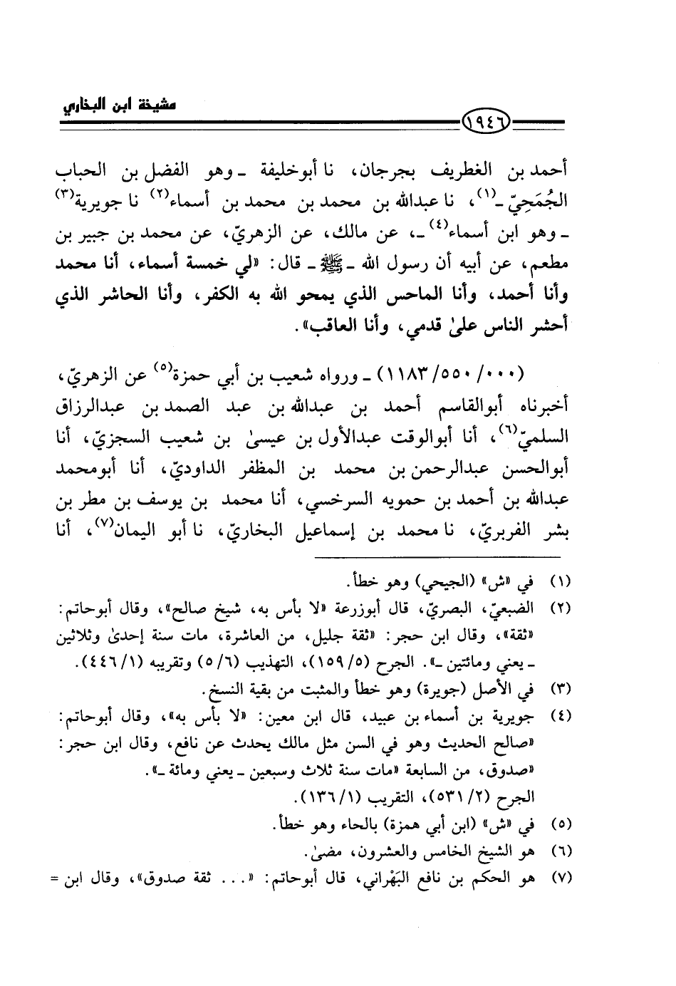 أَحْمَدَ بْنِ الْغِطْرِيفِ بِجُرْجَانَ، نَا أَبُو خَلِيفَةَ - وَهُوَ الْفَضْلُ بْنُ الْحُبَابِ الْجُمَحِيُّ -، نَا عَبْدُ اللَّهِ بْنُ مُحَمَّدِ بْنِ مُحَمَّدِ بْنِ أَسْمَاءَ نَا جُوَيْرِيَةُ - وَهُوَ ابْنُ أَسْمَاءَ -، عَنْ مَالِكٍ، عَنِ الزُّهْرِيِّ، عَنْ مُحَمَّدِ بْنِ جُبَيْرِ بْنِ مُطْعِمٍ، عَنْ أَبِيهِ أَنَّ رَسُولَ اللَّهِ - صَلَّى اللَّهُ عَلَيْهِ وَسَلَّم َ - قَالَ: " لِي خَمْسَةُ أَسْمَاءٍ، أَنَا مُحَمَّدٌ وَأَنَا أَحْمد، وَأَنا الماحس الَّذِي يَمْحُو اللَّهُ بِهِ الْكُفْرَ، وَأَنَا الْحَاشِرُ الَّذِي أَحْشُرُ النَّاسَ عَلَى قَدَمِي، وَأَنَا الْعَاقِبُ ".