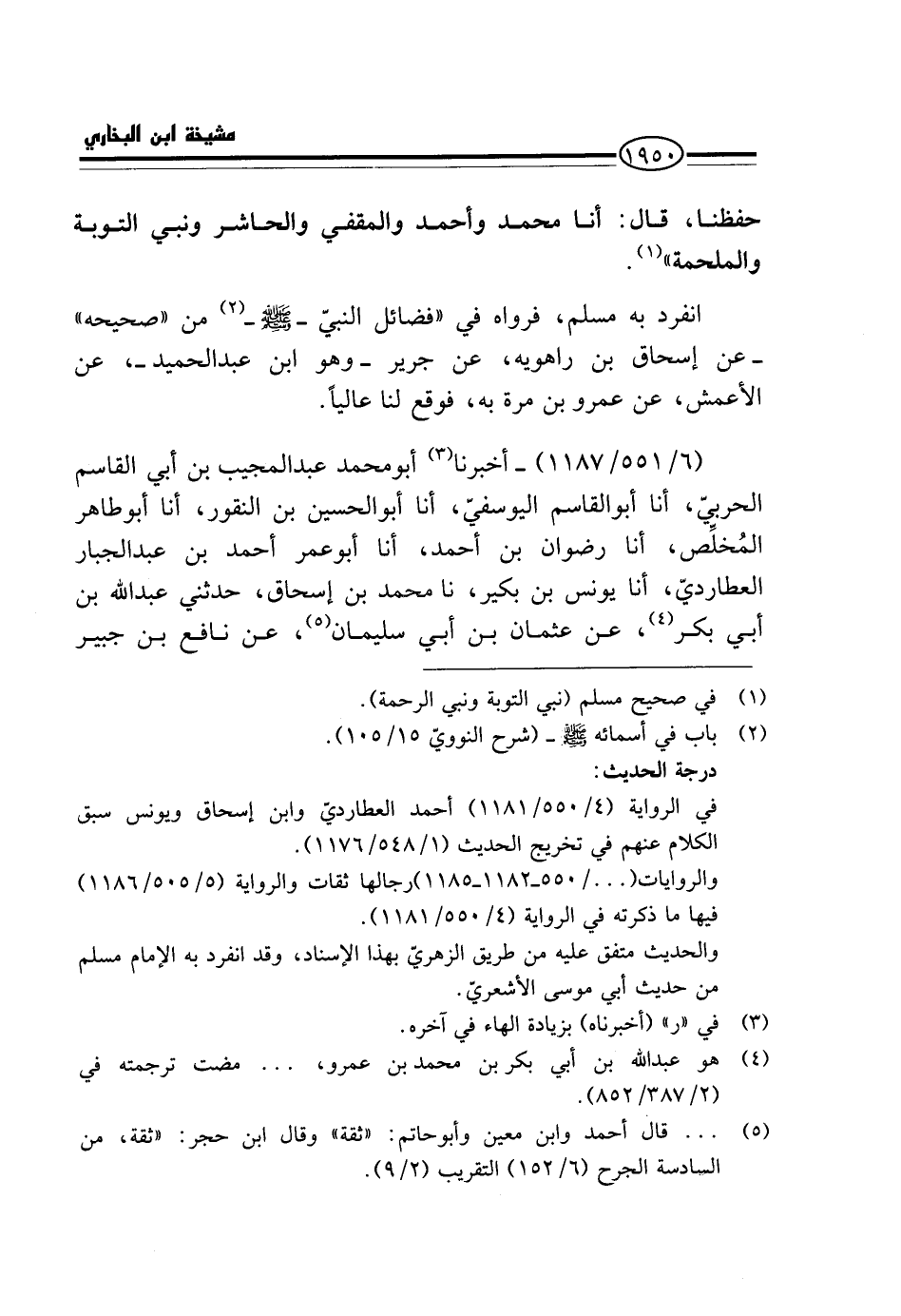 (6 / 551 / 1187) - أَخْبَرَنَا أَبُو مُحَمَّدٍ عَبْدُ الْمُجِيبِ بْنُ أَبِي الْقَاسِمِ الْحَرْبِيُّ، أَنَا أَبُو الْقَاسِمِ الْيُوسُفِيُّ، أَنَا أَبُو الْحُسَيْنِ بْنُ النَّقُّورِ، أَنَا أَبُو طَاهِرٍ الْمُخَلِّصُ، أَنَا رِضْوَانُ بْنُ أَحْمَدَ، أَنَا أَبُو عُمَرَ أَحْمَدُ بْنُ عَبْدِ الْجَبَّارِ الْعُطَارِدِيُّ، أَنَا يُونُسُ بْنُ بُكَيْرٍ، نَا مُحَمَّدُ بْنُ إِسْحَاقَ، حَدَّثَنِي عَبْدُ اللَّهِ بْنُ أَبِي بَكْرٍ، عَنْ عُثْمَانَ بْنِ أَبِي سُلَيْمَانَ، عَنْ نَافِعِ بن جُبَير