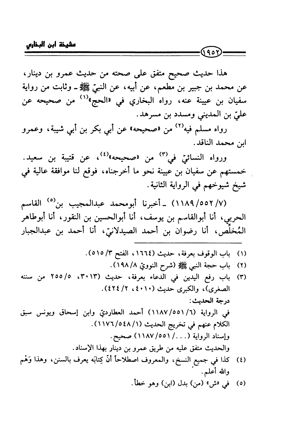 (7 / 552 / 1189) - أَخْبَرَنَا أَبُو مُحَمَّدٍ عَبْدُ الْمُجِيبِ بْنُ الْقَاسِمِ الْحَرْبِيُّ، أَنَا أَبُو الْقَاسِمِ بْنُ يُوسُفَ، أَنَا أَبُو الْحُسَيْنِ بْنُ النَّقُّورِ، أَنَا أَبُو طَاهِرٍ الْمُخَلِّصُ، أَنَا رِضْوَانُ بْنُ أَحْمَدَ الصَّيْدَلَانِيُّ، أَنَا أَحْمَدُ بْنُ عَبْدِ الْجَبَّارِ