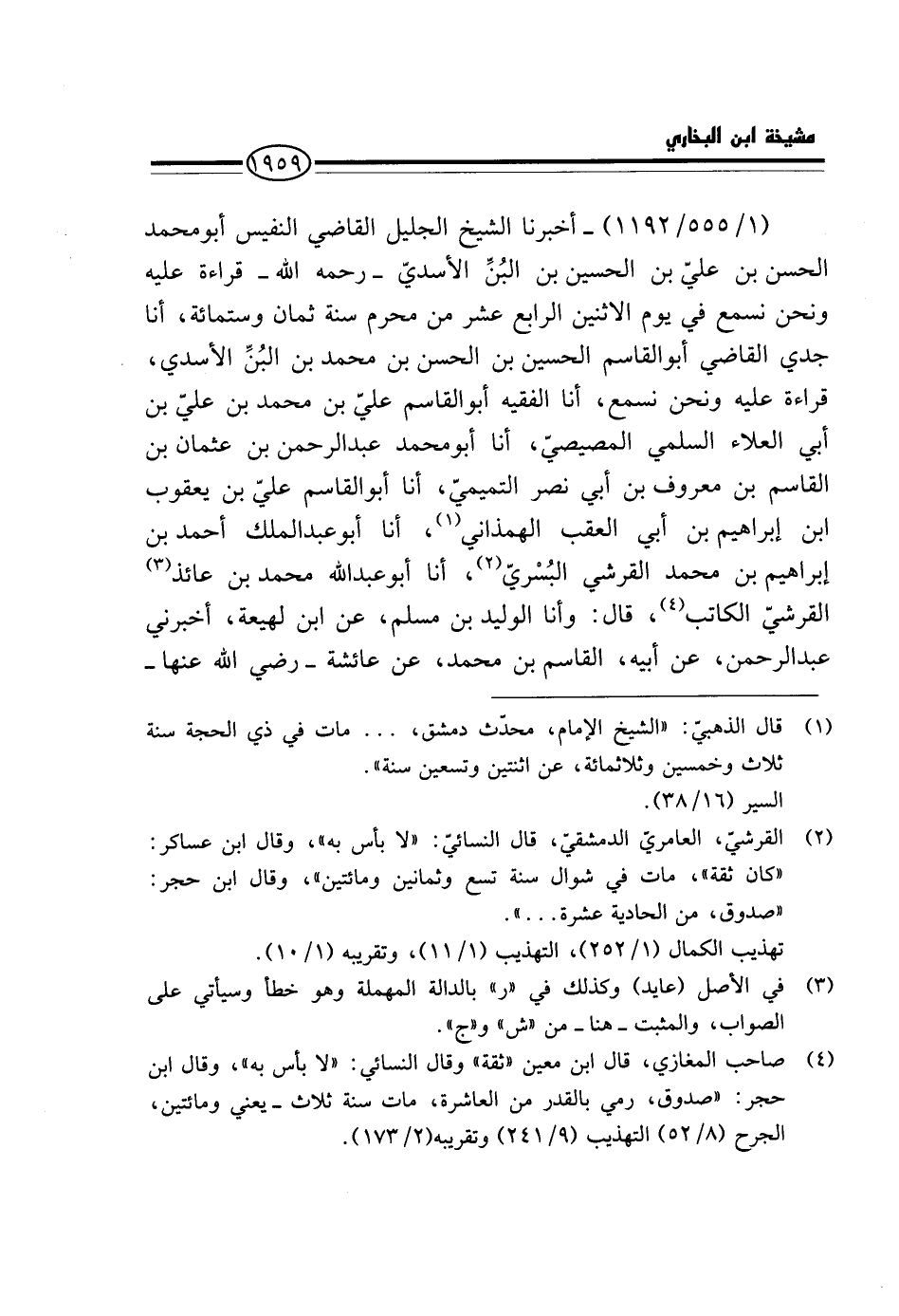 (1 / 555 / 1192) - أَخْبَرَنَا الشَّيْخُ الْجَلِيلُ الْقَاضِي النَّفِيسُ أَبُو مُحَمَّدٍ الْحَسَن بْن عَلِيّ بْن الْحُسَيْنِ بْن البن الْأسد - رَحِمَهُ اللَّهُ - قِرَاءَةً عَلَيْهِ وَنَحْنُ نَسْمَعُ فِي يَوْمِ الاثْنَيْنِ الرَّابِعِ عَشَرَ مِنْ مُحَرَّمٍ سَنَةَ ثَمَان وسِتمِائَة، أَنَا جَدِّي الْقَاضِي أَبُو الْقَاسِمِ الْحُسَيْنُ بْنُ الْحَسَنِ بْنِ مُحَمَّدِ بْنِ الْبُنِّ الأَسَدِيُّ، قِرَاءَةً عَلَيْهِ وَنَحْنُ نَسْمَعُ، أَنَا الْفَقِيهُ أَبُو الْقَاسِمِ عَلِيِّ بْنِ مُحَمَّدِ بْنِ عَلِيِّ بْنِ أَبِي الْعَلَاءِ السُّلَمِيُّ الْمِصِّيصِيُّ، أَنَا أَبُو مُحَمَّدٍ عَبْدُ الرَّحْمَنِ بْنُ عُثْمَانَ بْنِ الْقَاسِمِ بْنِ مَعْرُوفِ بْنِ أَبِي نَصْرٍ التَّمِيمِيُّ، أَنَا أَبُو الْقَاسِمِ عَليّ بن يَعْقُوب ابْن إِبْرَاهِيمَ بْنِ أَبِي الْعَقِبِ الْهَمَذَانِيُّ، أَنَا أَبُو عَبْدِ الْمَلِكِ أَحْمَدُ بْنُ إِبْرَاهِيمَ بْنِ مُحَمَّدٍ الْقُرَشِيُّ الْبُسْرِيُّ، أَنَا أَبُو عَبْدِ اللَّهِ مُحَمَّدُ بْنُ عَائِذٍ الْقُرَشِيُّ الْكَاتِبُ، قَالَ: وَأَنَا الْوَلِيدُ بْنُ مُسْلِمٍ، عَنِ ابْنِ لَهِيعَةَ، أَخْبَرَنِي عَبْدُ الرَّحْمَنِ، عَنْ أَبِيهِ، الْقَاسِمِ بْنِ مُحَمَّدٍ، عَنْ عَائِشَةَ - رَضِيَ اللَّهُ عَنْهَا -
