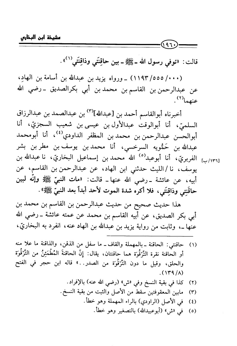 أَخْبَرَنَاهُ أَبُو الْقَاسِمِ أَحْمَدُ بْنُ [عَبْدِ اللَّهِ] بْنِ عَبْدِ الصَّمَدِ بْنِ عَبْدِ الرَّزَّاقِ السُّلَمِيُّ، أَنَا أَبُو الْوَقْتِ عَبْدُ الْأَوَّلِ بْنُ عِيسَى بْنِ شُعَيْبِ السِّجْزِيُّ، أَنَا أَبُو الْحَسَنِ عَبْدُ الرَّحْمَنِ بْنُ مُحَمَّدِ بْنِ الْمُظَفَّرِ الدَّاوُدِيُّ، أَنا أَبُو مُحَمَّدٍ عَبْدُ اللَّهِ بْنُ حَمُّوَيْهِ السَّرْخَسِيُّ، أَنَا مُحَمَّدُ بْنُ يُوسُفَ بْنِ مَطَرِ بْنِ بِشْرٍ الْفَرَبْرِيُّ، أَنَا أَبُو عَبْدِ اللَّهِ مُحَمَّدُ بْنُ إِسْمَاعِيلَ الْبُخَارِيُّ، نَا عَبْدُ اللَّهِ بْنُ يُوسُفَ، نَا / اللَّيْثُ حَدَّثَنِي ابْنُ الْهَادِ، عَنْ عَبْدِ الرَّحْمَنِ بْنِ الْقَاسِمِ، عَنْ أَبِيهِ، عَنْ عَائِشَةَ - رَضِيَ الله عَنْهَا - قَالَت: " مَاتَ النَّبِي - صَلَّى اللَّهُ عَلَيْهِ وَسَلَّم َ - وَإِنَّهُ لَبَيْنَ حَاقِنَتِي وَذَاقِنَتِي، فَلَا أَكْرَهُ شِدَّةَ الْمَوْت لأحد أبدا بعد النَّبِي - صَلَّى اللَّهُ عَلَيْهِ وَسَلَّم َ - ".