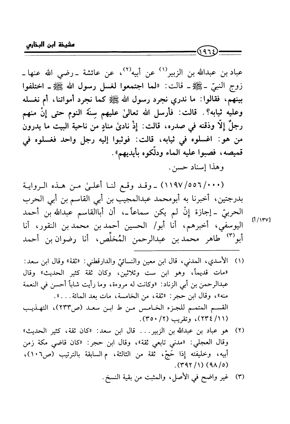 (000 / 556 / 1197) - وَقَدْ وَقَعَ لَنَا أَعْلَى مِنْ هَذِهِ الرِّوَايَةِ بِدَرَجَتَيْنِ، أَخْبَرَنَا بِهِ أَبُو مُحَمَّدٍ عَبْدُ الْمُجِيبِ بْنُ أَبِي الْقَاسِمِ بْنِ أَبِي الْحَرْبِ الْحَرْبِيُّ - إِجَازَةً إِنْ لَمْ يَكُنْ سَمَاعًا -، أَنَّ أَبَا الْقَاسِمِ عَبْدَ اللَّهِ بْنَ أَحْمَدَ الْيُوسُفِيَّ، أَخْبَرَهُمْ، أَنَا أَبُو / الْحُسَيْنِ أَحْمَدُ بْنُ مُحَمَّدِ بْنِ النَّقُّورِ، أَنَا أَبُو طَاهِرٍ مُحَمَّدُ بْنُ عَبْدِ الرَّحْمَنِ الْمُخَلِّصُ، أَنَا رِضْوَانُ بْنُ أَحْمَدَ