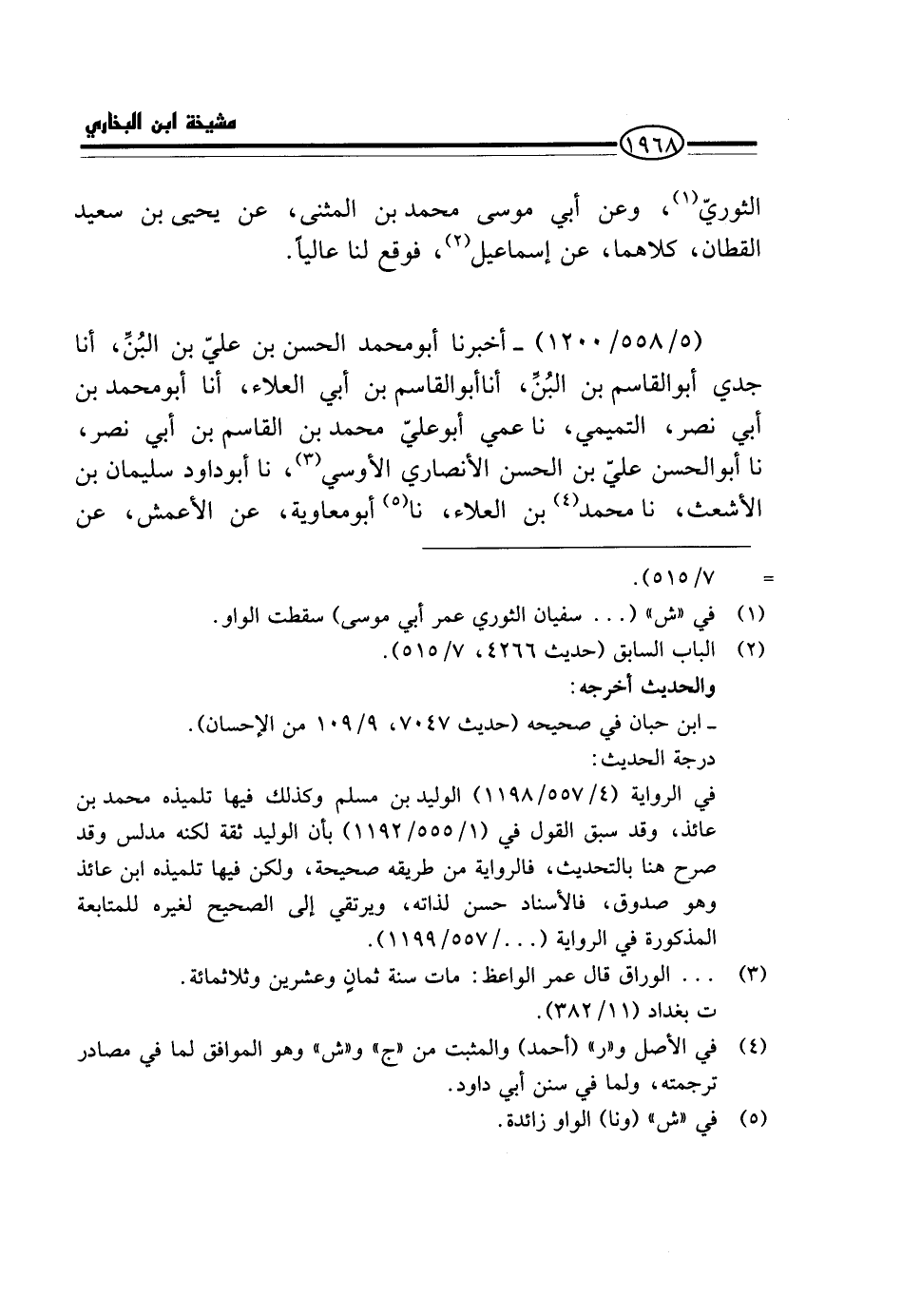 (5 / 558 / 1200) - أَخْبَرَنَا أَبُو مُحَمَّدٍ الْحَسَنُ بْنُ عَلِيِّ بْنِ الْبُنِّ، أَنَا جَدِّي أَبُو الْقَاسِمِ بْنُ الْبُنِّ، أَنَا أَبُو الْقَاسِمِ بْنُ أَبِي الْعَلَاءِ، أَنَا أَبُو مُحَمَّدِ بْنُ أَبِي نَصْرٍ، التَّمِيمِيُّ، نَا عَمِّي أَبُو عَلِيٍّ مُحَمَّدُ بْنُ الْقَاسِمِ بْنِ أَبِي نَصْرٍ، نَا أَبُو الْحَسَنِ عَلِيُّ بْنُ الْحَسَنِ الْأَنْصَارِيُّ الْأَوْسِيُّ، نَا أَبُو دَاوُدَ سُلَيْمَانُ بْنُ الْأَشْعَثِ، نَا مُحَمَّدُ بْنُ الْعَلَاءِ، نَا أَبُو مُعَاوِيَةَ، عَنِ الْأَعْمَش، عَن