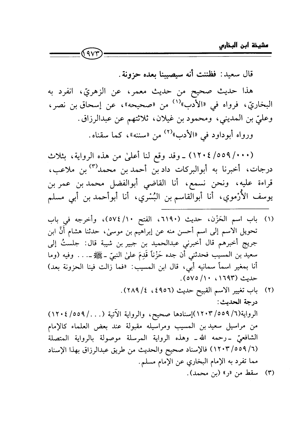 هَذَا حَدِيثٌ صَحِيحٌ مِنْ حَدِيثِ مَعْمَرٍ، عَنِ الزُّهْرِيِّ، انْفَرَدَ بِهِ الْبُخَارِيُّ، فَرَوَاهُ فِي " الْأَدَبِ " مِنْ " صَحِيحِهِ "، عَنْ إِسْحَاقَ بْنِ نَصْرٍ، وَعَلِيٍّ بن الْمَدِينِيِّ، وَمَحْمُودِ بْنِ غَيْلَانَ، ثَلَاثَتُهُمْ عَنْ عَبْدِ الرَّزَّاقِ.
