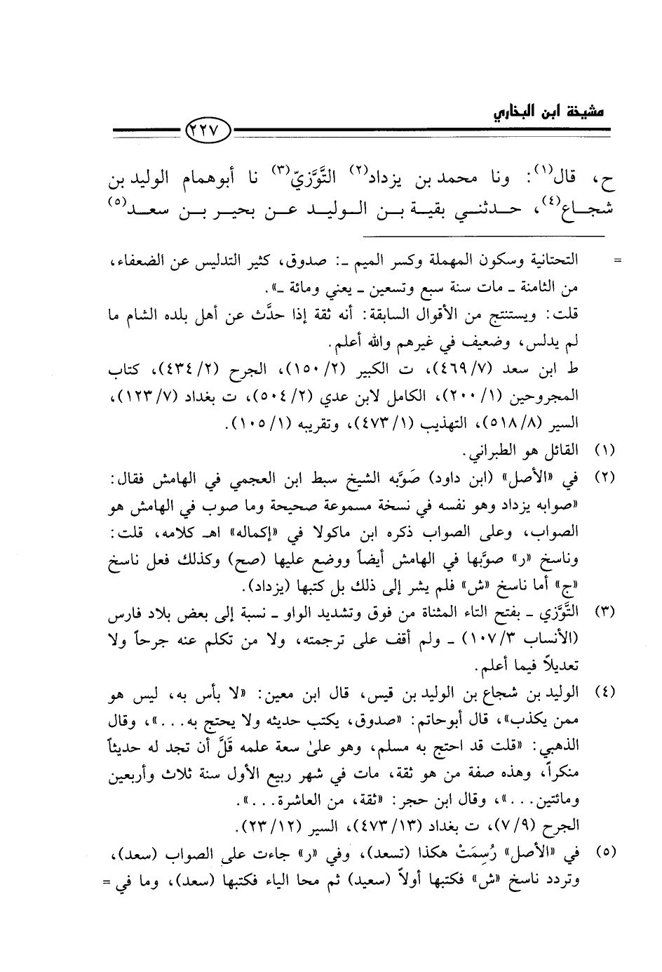 ح، قَالَ: ونا مُحَمَّدُ بْنُ يَزْدَادَ التُّوزِيُّ نَا أَبُو هَمَّامٍ الْوَلِيدُ بْنُ شُجَاعٍ، حَدَّثَنِي بَقِيَّةُ بْنُ الْوَلِيدِ عَنْ بَحِيرِ بْنِ سَعْدٍ