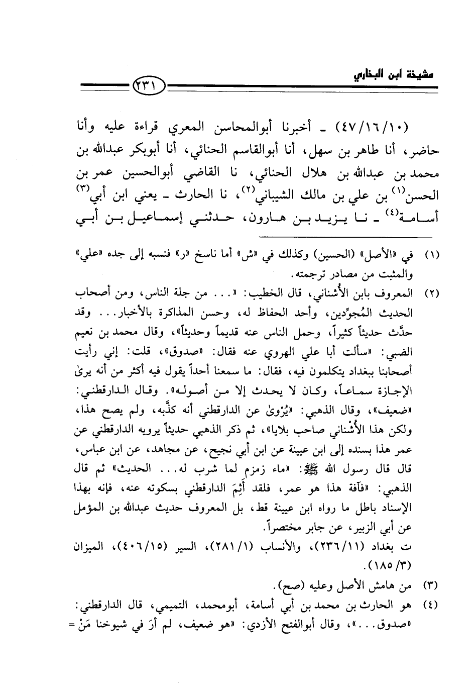 (10 / 16 / 47) - أَخْبَرَنَا أَبُو الْمَحَاسِنِ الْمَعَرِّيُّ قِرَاءَةً عَلَيْهِ وَأَنَا حَاضِرٌ، أَنَا طَاهِر بْن سهل، أَنَا أَبُو الْقَاسِمِ الحنائي، أَنَا أَبُو بَكْر عَبْد اللَّه بْنُ مُحَمَّدِ بْنِ عَبْدِ اللَّهِ بْنِ هِلَالٍ الحنائي، نَا الْقَاضِي أَبُو الْحُسَيْن عُمَر بْن الْحَسَنِ بْن عَلَي بْن مَالك الشَّيْبَانِيّ، نَا الْحَارِث - يَعْنِي ابْن أبي أُسَامَة - نَا يزِيد بْن هَارُون، حَدَّثَنِي إِسْمَاعِيل بْن أبي