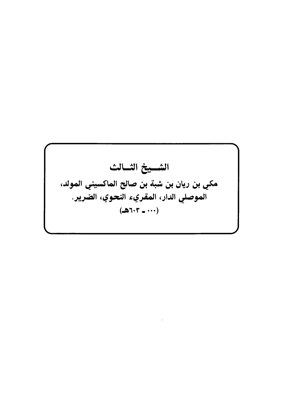 (الشَّيْخُ الثَّالِثُ مَكِّيُّ بْنُ رَيَّانَ بْنِ شَبَّةَ بْنِ صَالِح الْمَاكِسِينِيُّ الْمَوْلِدِ، الْمَوْصِلِيُّ الدَّارِ، الْمُقْرِئُ النَّحْوِيّ، الضَّرِير. (ِ (000 - 603 هـ))