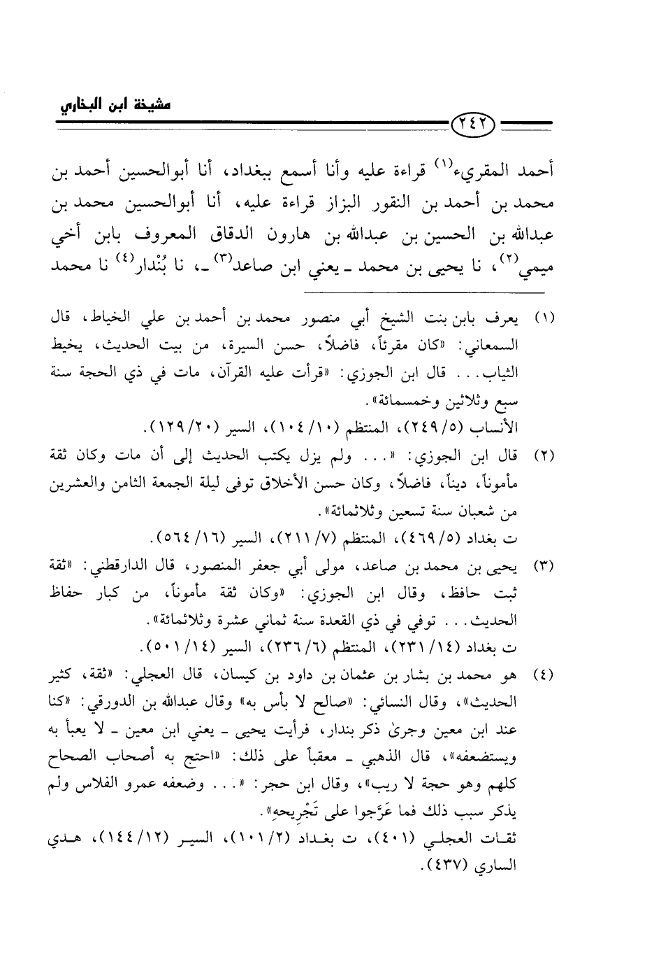 أَحْمد المقريء، قِرَاءَةً عَلَيْهِ وَأَنَا أَسْمَعُ بِبَغْدَادَ، أَنَا أَبُو الْحُسَيْنِ أَحْمَدُ بْنُ مُحَمَّدِ بْنِ أَحْمَدَ بْنِ النَّقُّورِ الْبَزَّازُ قِرَاءَةً عَلَيْهِ، أَنَا أَبُو الْحُسَيْنِ مُحَمَّدُ بْنُ عَبْدِ اللَّهِ بْنِ الْحُسَيْنِ بْنِ عَبْدِ اللَّهِ بْنِ هَارُونَ الدَّقَّاقُ الْمَعْرُوفُ بِابْنِ أَخِي ميمي، نَا يَحْيَى بْنُ مُحَمَّدٍ - يَعْنِي ابْنَ صَاعِدٍ -، نَا بُنْدَارٌ نَا مُحَمَّدٌ