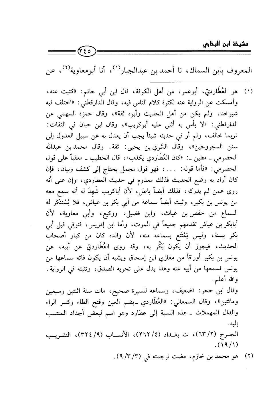 الْمَعُروفُ بِابْنِ السَّمَّاكِ، نَا أَحْمَدُ بْنُ عَبْدِ الْجَبَّارِ، أَنَا أَبُو مُعَاوِيَةَ، عَنْ