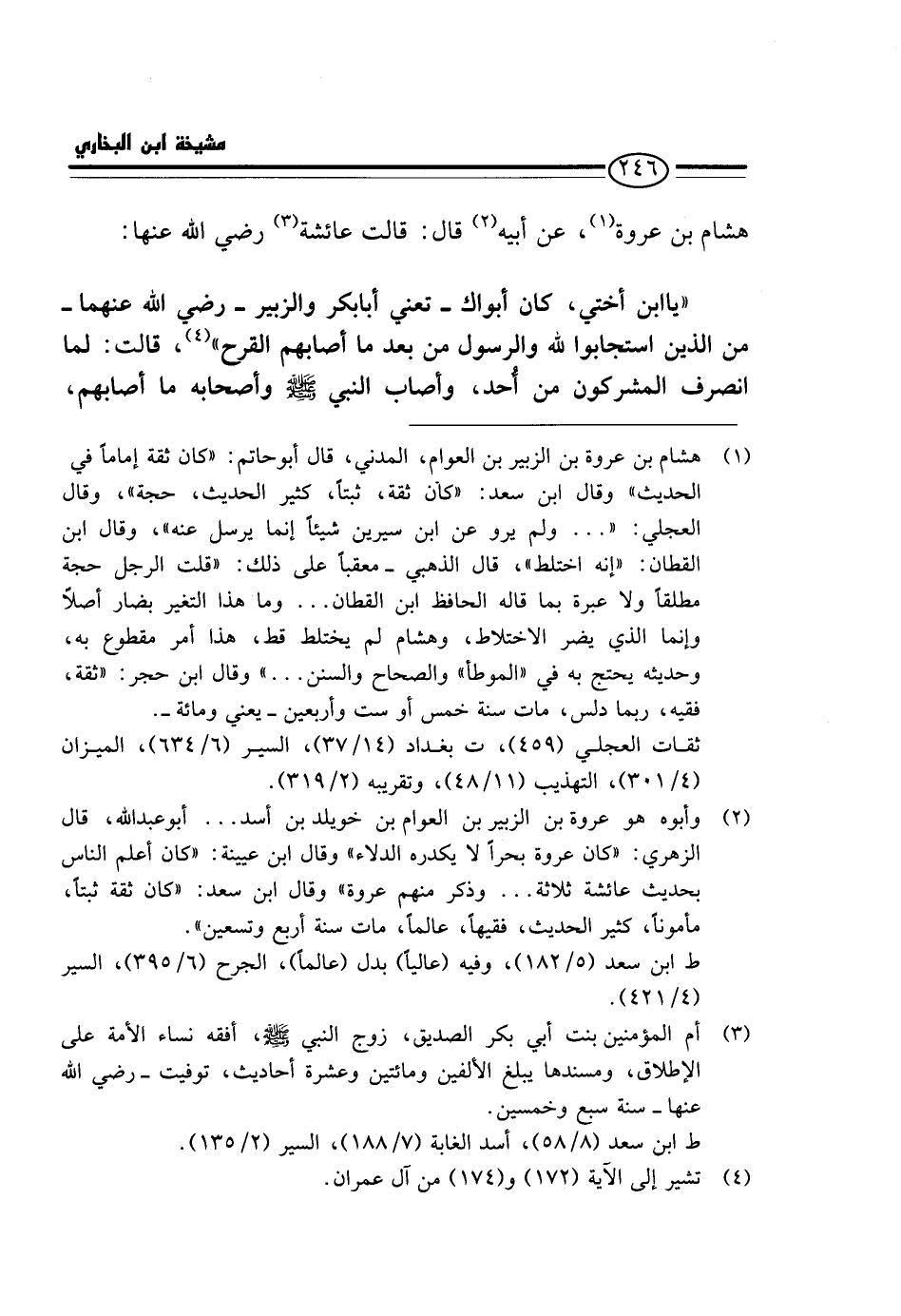 " يَا ابْنَ أُخْتِي، كَانَ أَبَوَاكَ - تَعْنِي أَبَا بَكْرٍ وَالزُّبَيْرَ - رَضِيَ اللَّهُ عَنْهُمَا - مِنَ الَّذِينَ اسْتَجَابُوا لِلَّهِ وَالرَّسُولِ مِنْ بَعْدِ مَا أَصَابَهُمُ الْقَرْح "، قَالَتْ: لَمَّا انْصَرف الْمُشْركُونَ من أحد، وَأصَاب النَّبِي - صَلَّى اللَّهُ عَلَيْهِ وَسَلَّم َ - وَأَصْحَابَهُ مَا أَصَابَهُمْ،