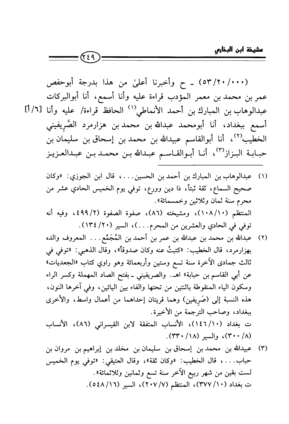 (000 / 20 / 53) - ح وَأَخْبَرَنَا أَعْلَى مِنْ هَذَا بِدَرَجَةٍ أَبُو حَفْصٍ عُمَرُ بْنُ مُحَمَّدِ بْنِ مَعْمَرٍ الْمُؤَدِّبُ قِرَاءَةً عَلَيْهِ وَأَنَا أَسْمَعُ، أَنَا أَبُو الْبَرَكَاتِ عَبْدُ الْوَهَّابِ بْنُ الْمُبَارَكِ بْنِ أَحْمَدَ الْأَنْمَاطِيُّ الْحَافِظُ قِرَاءَةً / عَلَيْهِ وَأَنَا أَسْمَعُ بِبَغْدَادَ، أَنَا أَبُو مُحَمَّدٍ عَبْدُ اللَّهِ بْنُ مُحَمَّدِ بْنِ هَزَارَمَرْدَ الصَّرِيفِينِيُّ الْخَطِيبُ، أَنَا أَبُو الْقَاسِمِ عُبَيْدُ اللَّهِ بْنُ مُحَمَّدِ بْنِ إِسْحَاقَ بْنِ سُلَيْمَانَ بْنِ حَبَابَةَ الْبَزَّازُ، أَنَا أَبُو الْقَاسِمِ عَبْدُ اللَّهِ بْنُ مُحَمَّدِ بْنِ عَبْدِ الْعَزِيزِ