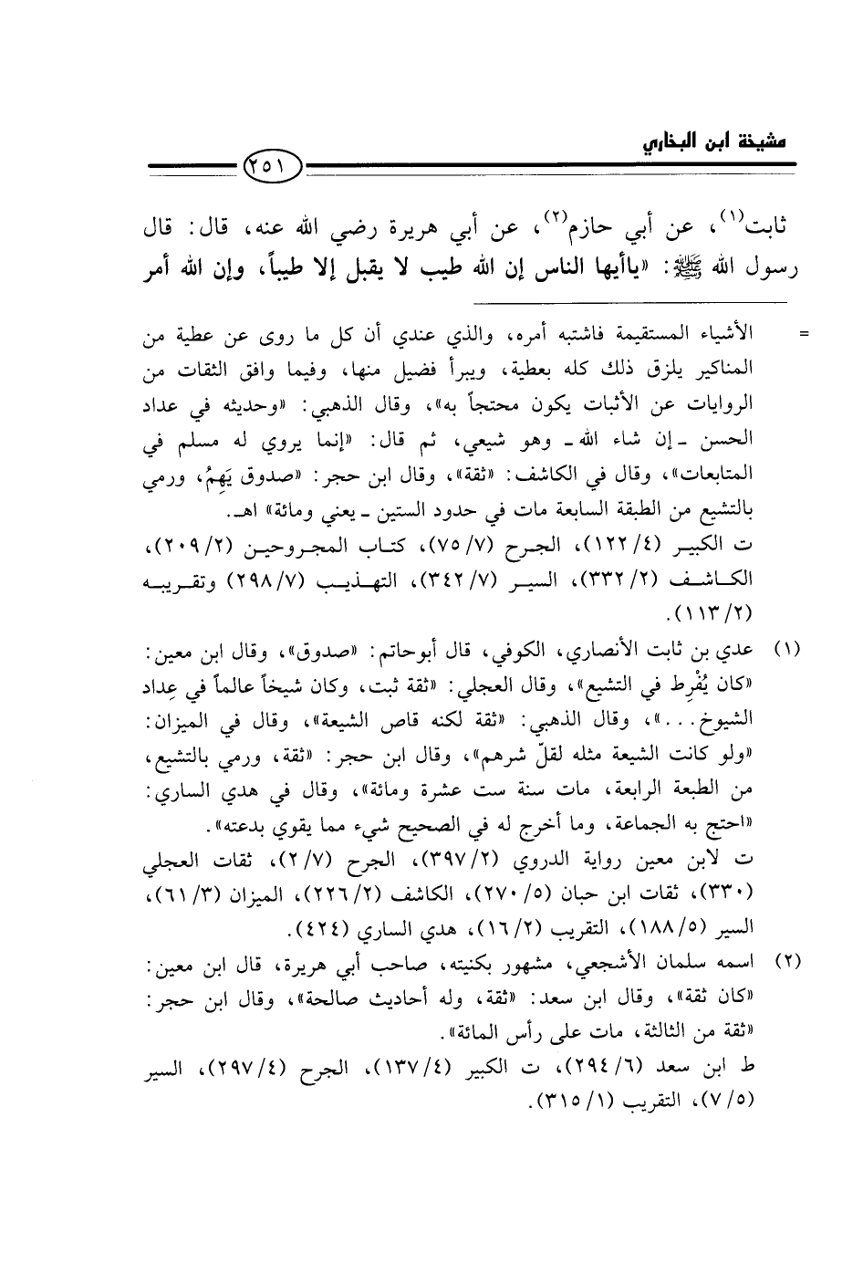 ثَابِتٍ، عَنْ أَبِي حَازِمٍ، عَنْ أَبِي هُرَيْرَةَ رَضِيَ اللَّهُ عَنْهُ، قَالَ: قَالَ رَسُولُ اللَّهِ - صَلَّى اللَّهُ عَلَيْهِ وَسَلَّم َ -: " يَا أَيهَا النَّاسُ إِنَّ اللَّهَ طَيِّبٌ لَا يَقْبَلُ إِلَّا طَيِّبًا، وَإِنَّ اللَّهَ أَمَرَ