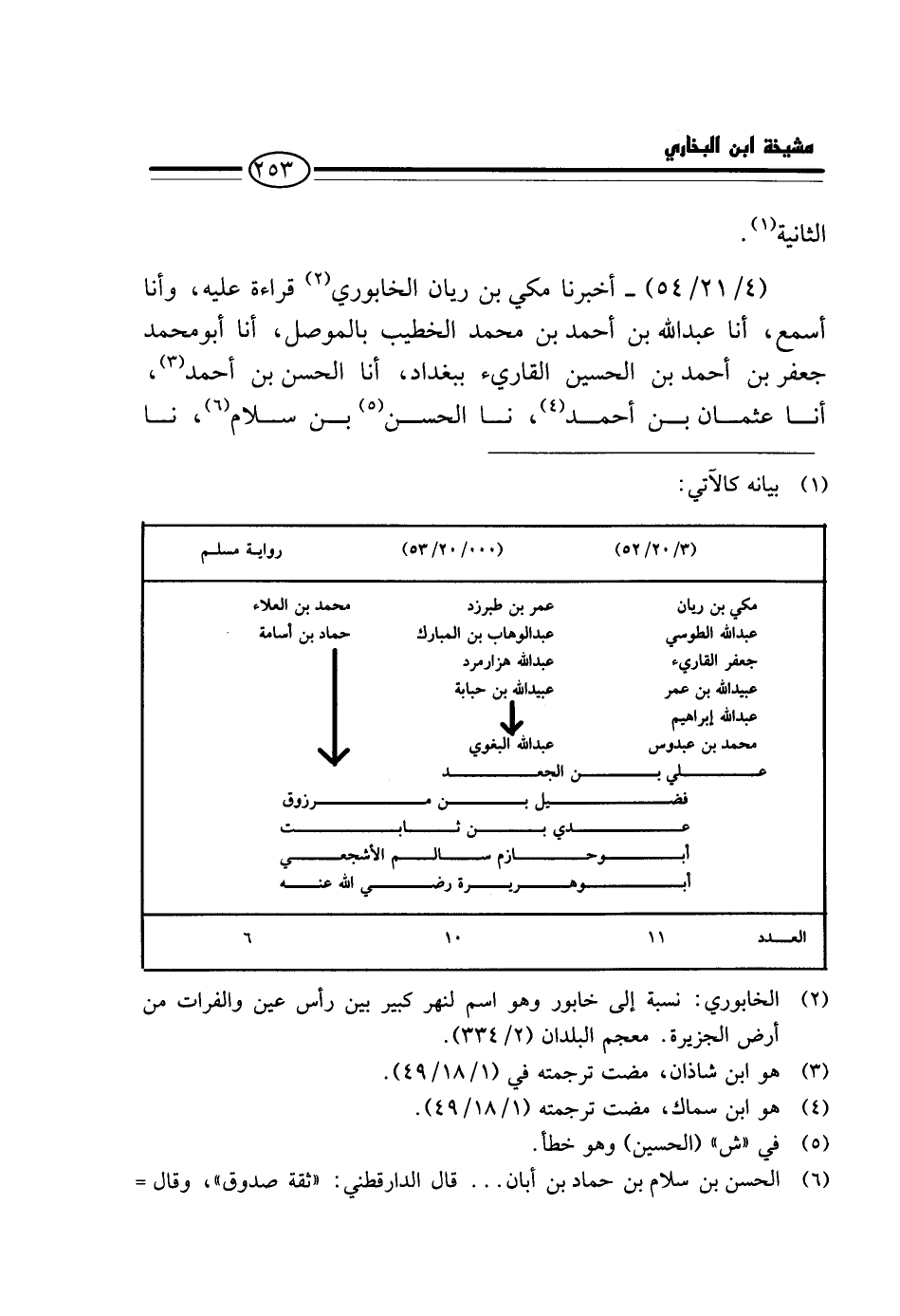(4 / 21 / 54) - أَخْبَرَنَا مَكِّيُّ بْنُ رَيَّانَ الْخَابُورِيُّ قِرَاءَةً عَلَيْهِ، وَأَنَا أَسْمَعُ، أَنَا عَبْدُ اللَّهِ بْنُ أَحْمَدَ بْنِ مُحَمَّدٍ الْخَطِيبُ بِالْمَوْصِلِ، أَنَا أَبُو مُحَمَّد جَعْفَر بن احْمَد بن الْحُسَيْن القاريء بِبَغْدَادَ، أَنَا الْحَسَنُ بْنُ أَحْمَدَ، أَنَا عُثْمَانُ بْنُ أَحْمَدَ، نَا الْحَسَنُ بْنُ سَلامٍ، نَا
