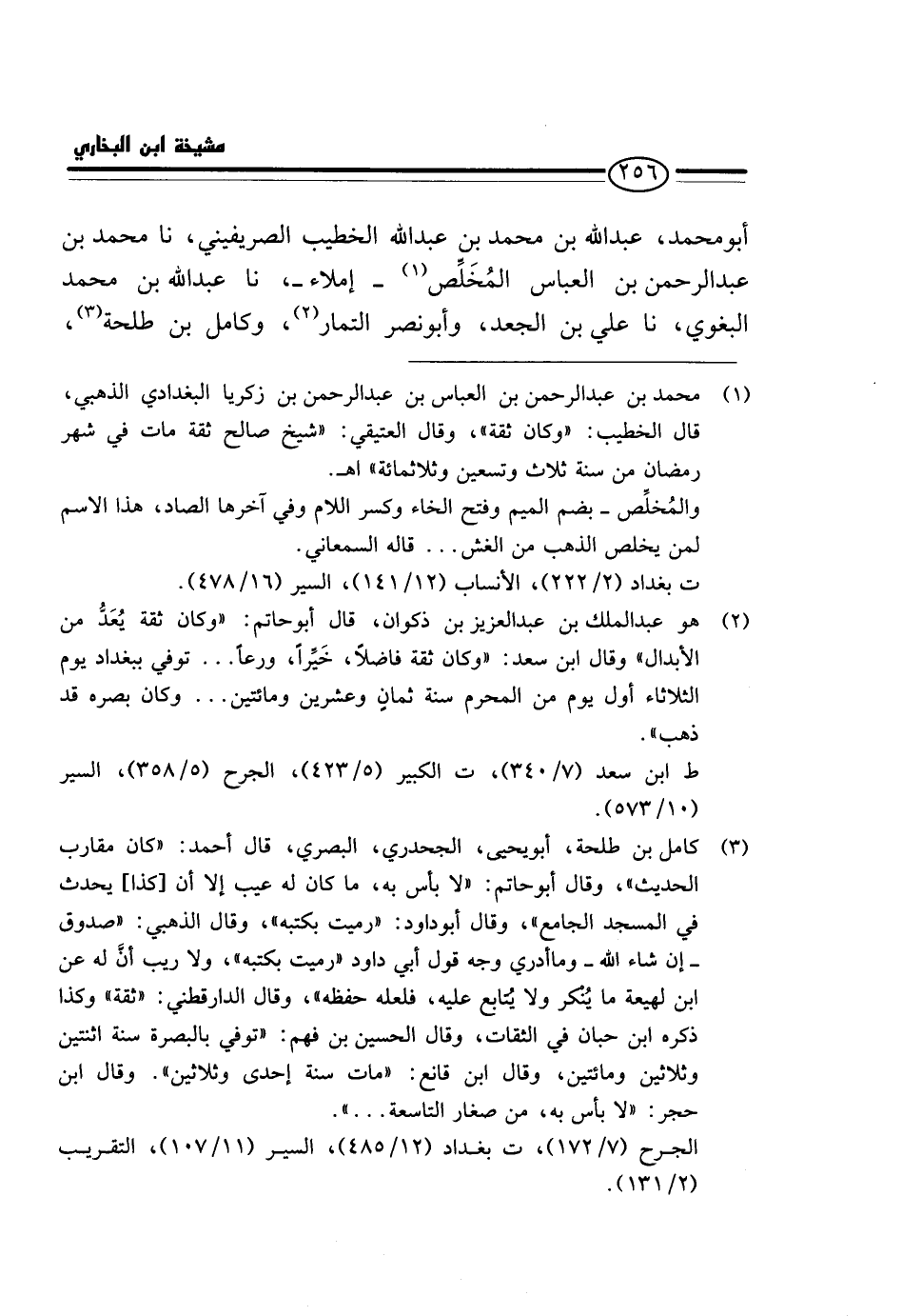 أَبُو مُحَمَّدٍ، عَبْدُ اللَّهِ بْنُ مُحَمَّدِ بْنِ عَبْدِ اللَّهِ الْخَطِيبُ الصَّرِيفِينِيُّ، نَا مُحَمَّدُ بْنُ عَبْدِ الرَّحْمَنِ بْنِ الْعَبَّاسِ الْمُخَلِّصُ - إِمْلاءً -، نَا عَبْدُ اللَّهِ بْنُ مُحَمَّدٍ الْبَغَوِيُّ، نَا عَلِيُّ بْنُ الْجَعْدِ، وَأَبُو نَصْرٍ التَّمَّارُ، وَكَامِلُ بْنُ طَلْحَة،