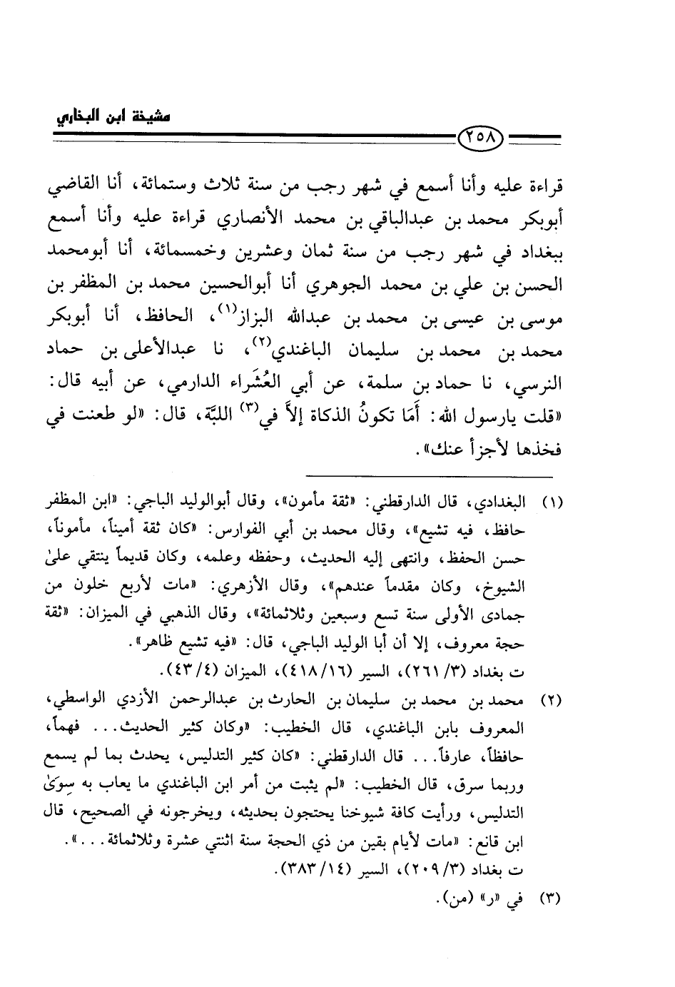 قِرَاءَةً عَلَيْهِ وَأَنَا أَسْمَعُ فِي شَهْرِ رَجَبٍ من سنة ثَلَاث وسِتمِائَة، أَنَا الْقَاضِي أَبُو بَكْرٍ مُحَمَّدُ بْنُ عَبْدِ الْبَاقِي بْنِ مُحَمَّدٍ الْأَنْصَارِيُّ قِرَاءَةً عَلَيْهِ وَأَنَا أَسْمَعُ بِبَغْدَادَ فِي شَهْرِ رَجَبٍ مِنْ سَنَةِ ثَمَان وَعشْرين وَخَمْسمِائة، أَنَا أَبُو مُحَمَّدٍ الْحَسَنُ بْنُ عَلِيِّ بْنِ مُحَمَّدٍ الْجَوْهَرِيُّ أَنَا أَبُو الْحُسَيْنِ مُحَمَّدُ بْنُ الْمُظَفَّرِ بْنِ مُوسَى بْنِ عِيسَى بْنِ مُحَمَّدِ بْنِ عَبْدِ اللَّهِ الْبَزَّازُ، الْحَافِظُ، أَنَا أَبُو بَكْرٍ مُحَمَّدُ بْنُ مُحَمَّدِ بْنِ سُلَيْمَانَ الْبَاغَنْدِيُّ، نَا عَبْدُ الْأَعْلَى بْنُ حَمَّادٍ النَّرْسِيُّ، نَا حَمَّادُ بْنُ سَلَمَةَ، عَنْ أَبِي الْعَشْرَاءِ الدَّارِمِيِّ، عَنْ أَبِيهِ قَالَ: " قُلْتُ يَا رَسُولَ اللَّهِ: أَمَا تَكُونُ الذَّكَاةُ إِلَّا فِي اللَّبَّةِ، قَالَ: " لَوْ طَعَنْتَ فِي فَخِذِهَا لَأَجْزَأَ عَنْكَ ".