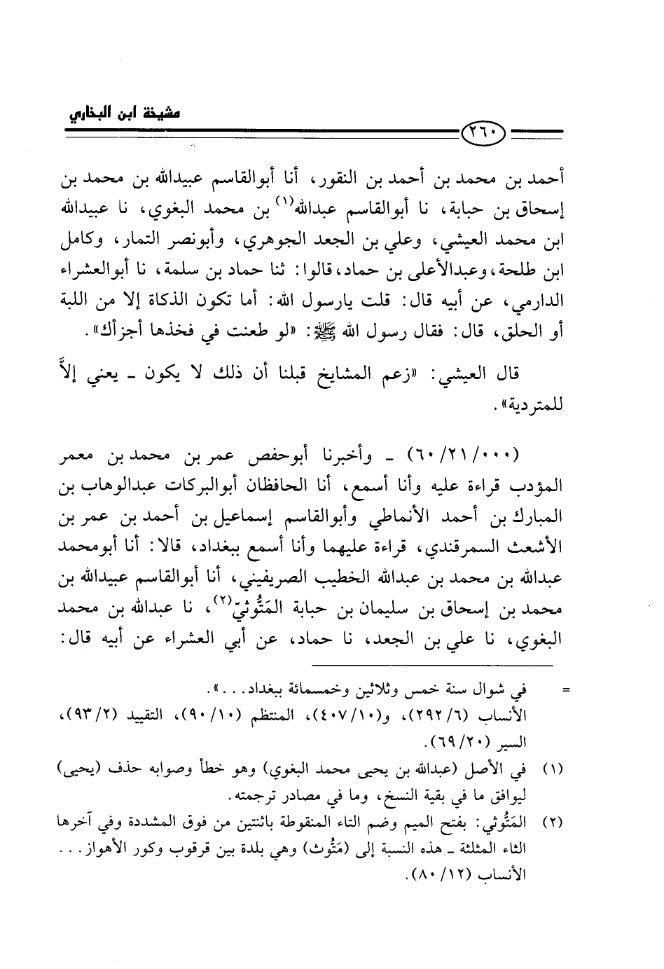 (000 / 21 / 60) - وَأَخْبَرَنَا أَبُو حَفْصٍ عُمَرُ بْنُ مُحَمَّدِ بْنِ مَعْمَرٍ الْمُؤَدِّبُ قِرَاءَةً عَلَيْهِ وَأَنَا أَسْمَعُ، أَنَا الْحَافِظَانِ أَبُو الْبَرَكَاتِ عَبْدُ الْوَهَّابِ بْنُ الْمُبَارَكِ بْنِ أَحْمَدَ الْأَنْمَاطِيُّ وَأَبُو الْقَاسِمِ إِسْمَاعِيلُ بْنُ أَحْمَدَ بْنِ عُمَرَ بْنِ الْأَشْعَثِ السَّمَرْقَنْدِيُّ، قِرَاءَةً عَلَيْهِمَا وَأَنَا أَسْمَعُ بِبَغْدَادَ، قَالَا: أَنَا أَبُو مُحَمَّدٍ عَبْدُ اللَّهِ بْنُ مُحَمَّدِ بْنِ عَبْدِ اللَّهِ الْخَطِيبُ الصَّرِيفِينِيُّ، أَنَا أَبُو الْقَاسِمِ عُبَيْدُ اللَّهِ بْنُ مُحَمَّدِ بْنِ إِسْحَاقَ بْنِ سُلَيْمَانَ بْنِ حَبَابَةَ الْمَتُّوثِيُّ، نَا عَبْدُ اللَّهِ بْنُ مُحَمَّدٍ الْبَغَوِيُّ، نَا عَلِيُّ بْنُ الْجَعْدِ، نَا حَمَّادٌ، عَنْ أَبِي الْعَشْرَاءِ عَنْ أَبِيهِ قَالَ: