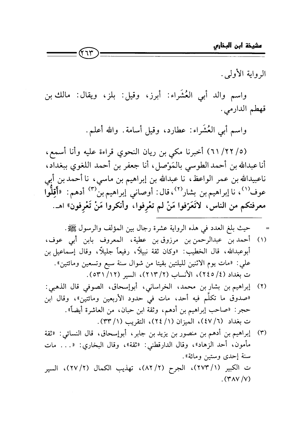 (5 / 22 / 61) - أَخْبَرَنَا مكي بْن رَيَّان النَّحْوِيّ قِرَاءَة عَلَيْهِ وَأَنَا أَسْمَعُ، أَنَا عَبْدُ اللَّهِ بْنُ أَحْمَدَ الطوسي، بالموصل، أَنَا جَعْفَر بْن أَحْمَدَ اللّغَوِيّ بِبَغْدَاد، نَا عُبَيْد اللَّه بْن عُمَر الْوَاعِظ، نَا عَبْد اللَّه بْن إِبْرَاهِيمَ بْن ماسي، نَا أَحْمَد بْن أبي عَوْف، نَا إِبْرَاهِيم بْن بشار، قَالَ: أَوْصَانِي إِبْرَاهِيم بْن أدهم: " أقلوا معرفتكم من النَّاس، لَا تعرفوا من لم تعرفوا، وأنكروا من تعرفُون " اه.