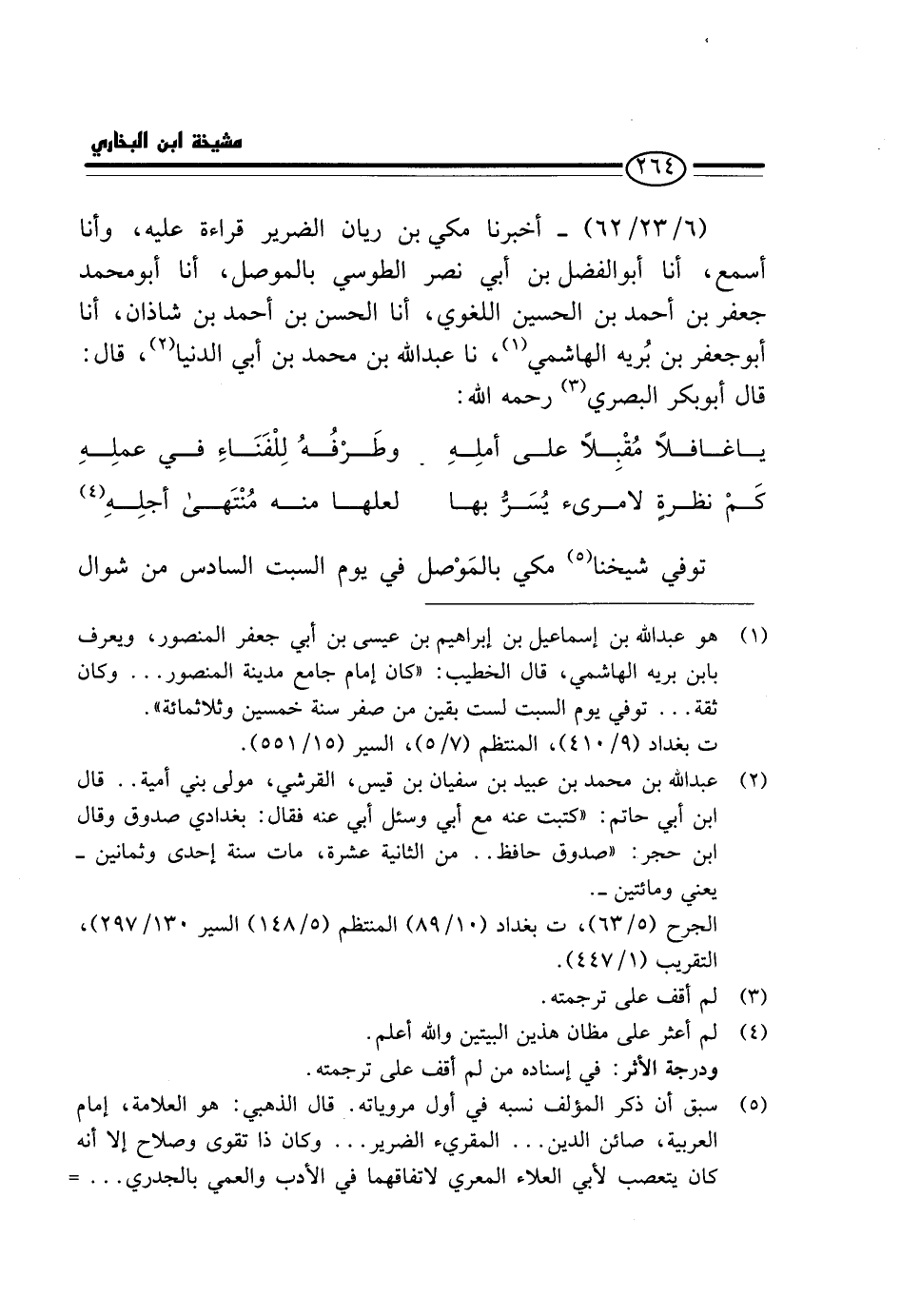 (6 / 23 / 62) - أَخْبَرَنَا مكي بْن رَيَّان الضَّرِير قِرَاءَة عَلَيْهِ، وَأَنَا أسمع، أَنَا أَبُو الْفَضْلِ بْن أبي نصر الطوسي بالموصل، أَنَا أَبُو مُحَمَّد جَعْفَر بْن أَحْمَدَ بْن الْحُسَيْنِ اللّغَوِيّ، أَنَا الْحَسَن بْن أَحْمَدَ بْن شَاذان، أَنَا أَبُو جَعْفَر بْن بريه الْهَاشِمِي، نَا عَبْد اللَّه بْن مُحَمَّدِ بْن أبي الدُّنْيَا، قَالَ: قَالَ أَبُو بَكْر الْبَصْرِيّ رَحِمَهُ اللَّهُ: