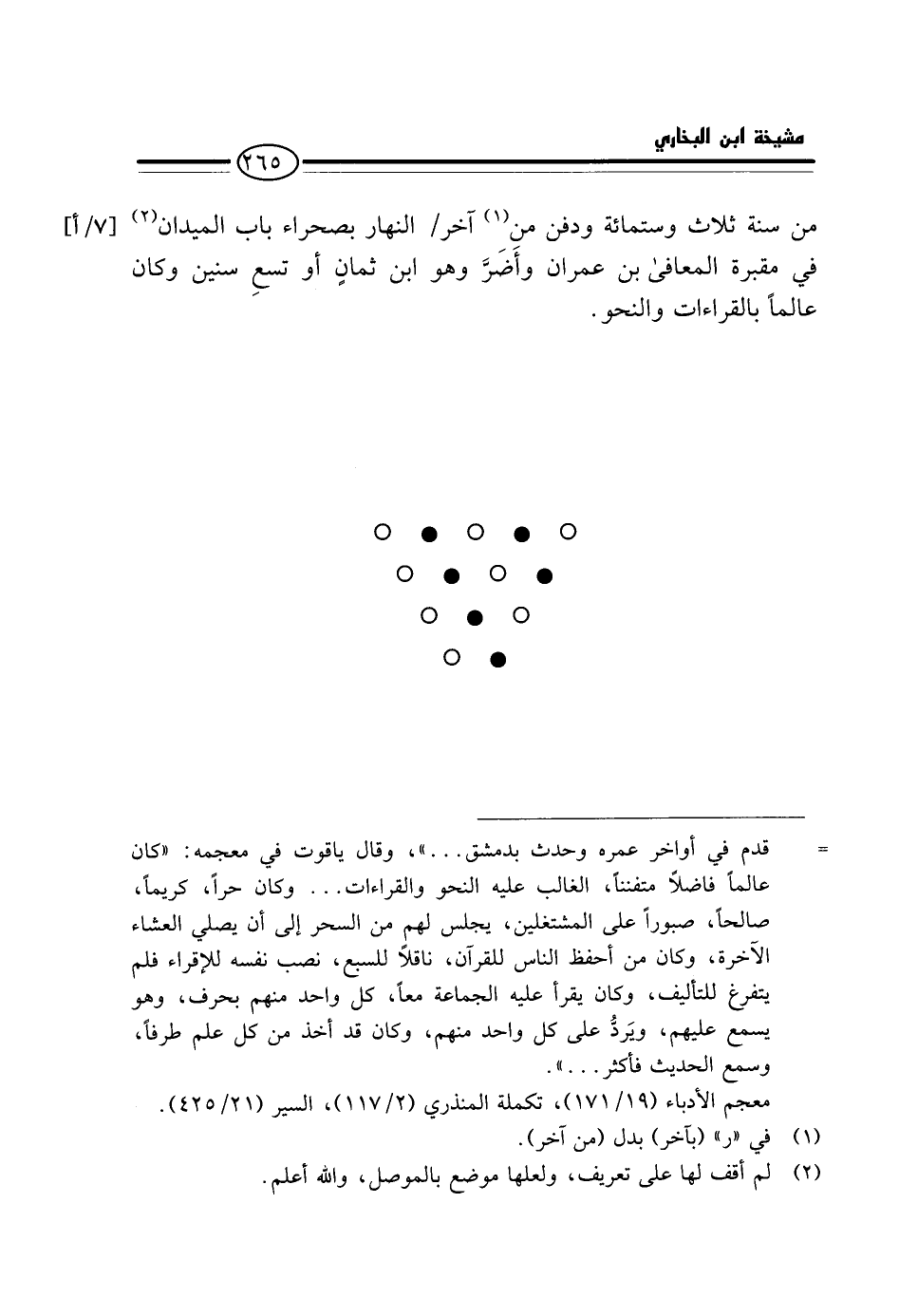 من سنة ثَلَاث وسِتمِائَة وَدفن من آخر / النَّهَار بصحراء بَاب الميدان فِي مَقْبرَة الْمُعَافَى بْن عِمْرَانَ وأضر وَهُوَ ابْن ثَمَان أَوْ تسع سِنِين وَكَانَ عَالما بالقراءات والنحو.