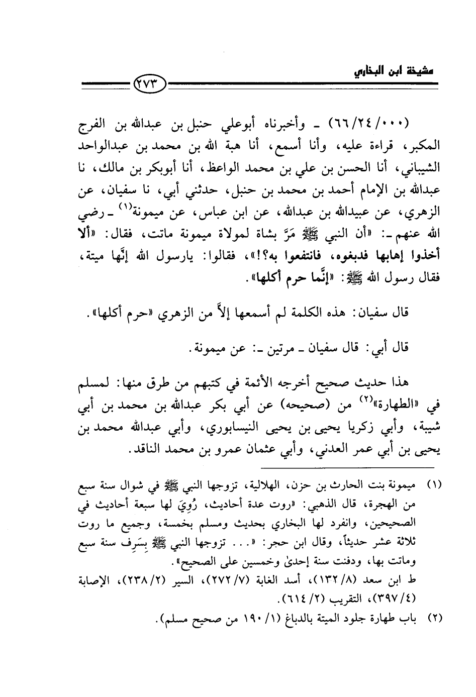 (000 / 24 / 66) - وَأَخْبَرَنَاهُ أَبُو عَلِيٍّ حَنْبَلُ بْنُ عَبْدِ اللَّهِ بْنِ الْفَرَجِ الْمُكَبِّرُ، قِرَاءَةً عَلَيْهِ، وَأَنَا أَسْمَعُ، أَنَا هِبَةُ اللَّهِ بْنُ مُحَمَّدِ بْنِ عَبْدِ الْوَاحِدِ الشَّيْبَانِيُّ، أَنَا الْحَسَنُ بْنُ عَلِيِّ بْنِ مُحَمَّدٍ الْوَاعِظُ، أَنَا أَبُو بَكْرِ بْنُ مَالِكٍ، نَا عبد الله بن الْإِمَامِ أَحْمَدَ بْنِ مُحَمَّدِ بْنِ حَنْبَلٍ، حَدَّثَنِي أَبِي، نَا سُفْيَانُ، عَنِ الزُّهْرِيِّ، عَنْ عُبَيْدِ اللَّهِ بْنِ عَبْدِ اللَّهِ، عَنِ ابْنِ عَبَّاسٍ، عَنْ مَيْمُونَةَ - رَضِيَ اللَّهُ عَنْهُمْ -: " أَنَّ النَّبِيَّ - صَلَّى اللَّهُ عَلَيْهِ وَسَلَّم َ - مَرَّ بِشَاةٍ لِمَوْلَاةِ مَيْمُونَةَ مَاتَتْ، فَقَالَ: " أَلَا أَخَذُوا إِهَابَهَا فَدَبَغُوهُ، فَانْتَفَعُوا بِهِ؟ ! ، فَقَالُوا: يَا رَسُولَ اللَّهِ إِنَّهَا مَيْتَةٌ، فَقَالَ رَسُولُ اللَّهِ - صَلَّى اللَّهُ عَلَيْهِ وَسَلَّم َ -: " إِنَّمَا حُرِّمُ أَكْلُهَا ".