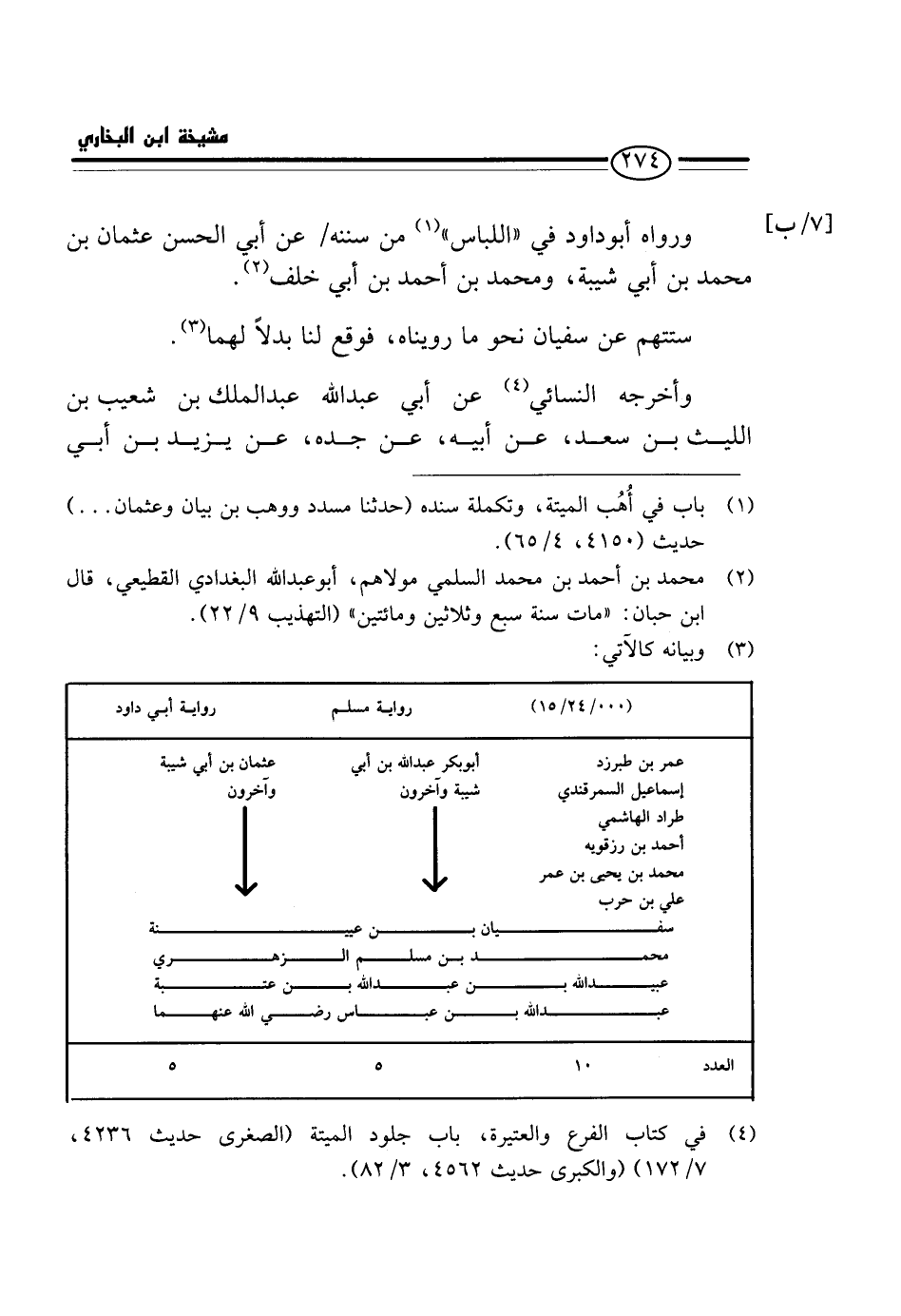 وَرَوَاهُ أَبُو دَاوُدَ فِي " اللِّبَاسِ " مِنْ سُنَنِهِ / عَنْ أَبِي الْحَسَنِ عُثْمَانَ بْنِ مُحَمَّدِ بْنِ أَبِي شَيْبَةَ، وَمُحَمَّدِ بْنِ أَحْمَدَ بْنِ أَبِي خَلَفٍ.