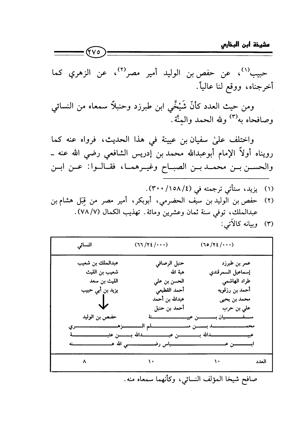 وَمِنْ حَيْثُ الْعَدِدِ كَأَنَّ شَيْخِي ابْنَ طَبَرْزَدَ وَحَنْبَلًا سَمِعَاهُ مِنَ النَّسَائِيِّ وَصَافَحَاهُ بِهِ وَلِلَّهِ الْحَمْدُ وَالْمِنَّةُ.