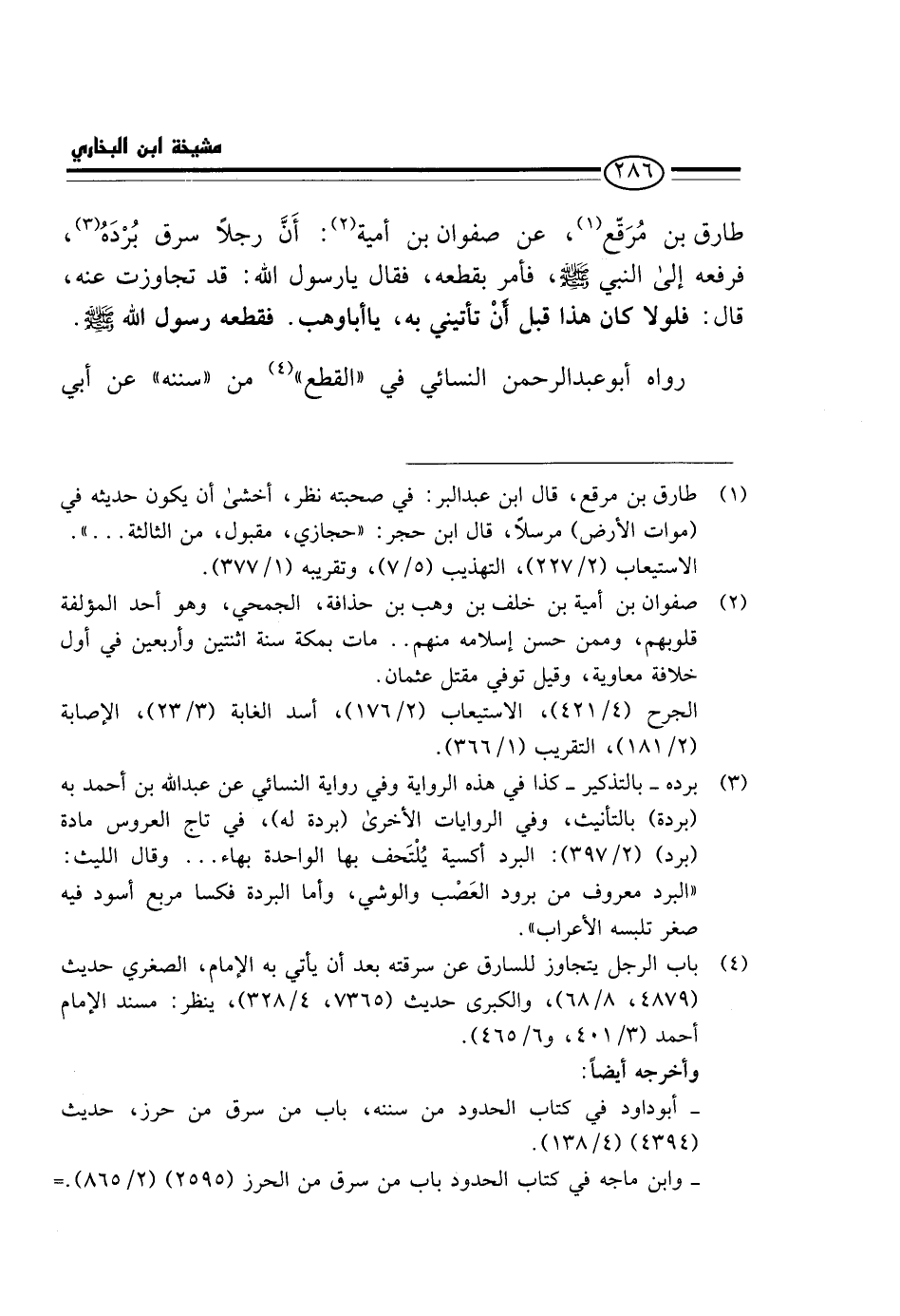 طَارِقِ بْنِ مُرَقَّعٍ، عَنْ صَفْوَانَ بْنِ أُمَيَّةَ: أَنَّ رَجُلًا سَرَقَ بُرْدَهُ، فَرَفَعَهُ إِلَى النَّبِيِّ - صَلَّى اللَّهُ عَلَيْهِ وَسَلَّم َ -، فَأَمَرَ بِقَطْعِهِ، فَقَالَ يَا رَسُولَ اللَّهِ: قَدْ تَجَاوَزْتُ عَنْهُ، قَالَ: فَلَوْلَا كَانَ هَذَا قَبْلَ أَنْ تَأْتِيَنِي بِهِ، يَا أَبَا وَهْبٍ، فَقَطَعَهُ رَسُول الله - صَلَّى اللَّهُ عَلَيْهِ وَسَلَّم َ -.