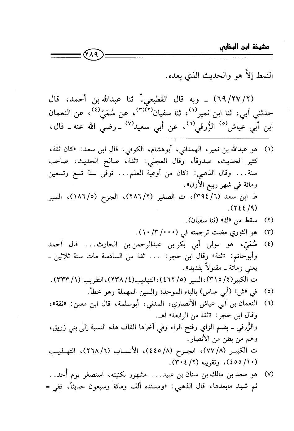 (2 / 27 / 69) - وَبِهِ قَالَ الْقَطِيعِيُّ: ثَنَا عَبْدُ اللَّهِ بْنُ أَحْمَدَ، قَالَ حَدَّثَنِي أَبِي، ثَنَا ابْنُ نُمَيْرٍ، ثَنَا سُفْيَان، عَن سمي، عَن النُّعْمَان ابْن أَبِي عَيَّاشٍ الزُّرَقِيِّ، عَنْ أَبِي سَعِيدٍ - رَضِيَ الله عَنهُ - قَالَ،
