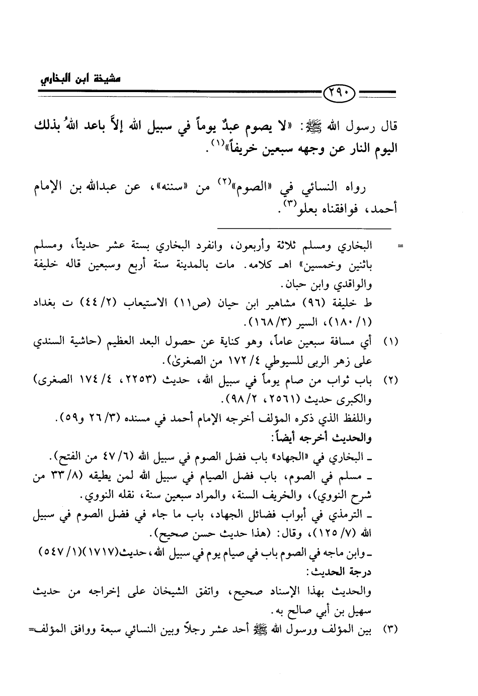 رَوَاهُ النَّسَائِيُّ فِي " الصَّوْمِ " من " سنَنه "، عَن عبد الله بن الْإِمَامِ أَحْمَدَ، فَوَافَقْنَاهُ بِعُلُوٍّ.