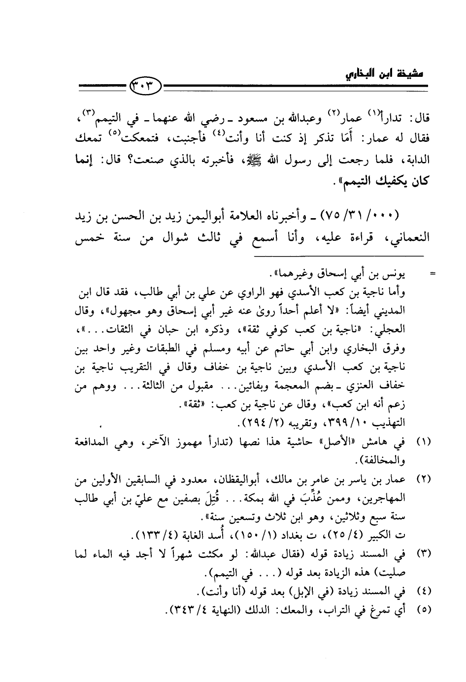 (000 / 31 / 75) - وَأَخْبَرَنَاهُ الْعَلَّامَةُ أَبُو الْيُمْنِ زَيْدُ بْنُ الْحَسَنِ بْنِ زَيْدٍ النُّعْمَانِيُّ، قِرَاءَةً عَلَيْهِ، وَأَنَا أَسْمَعُ فِي ثَالِثِ شَوَّالٍ مِنْ سَنَةِ خَمْسٍ