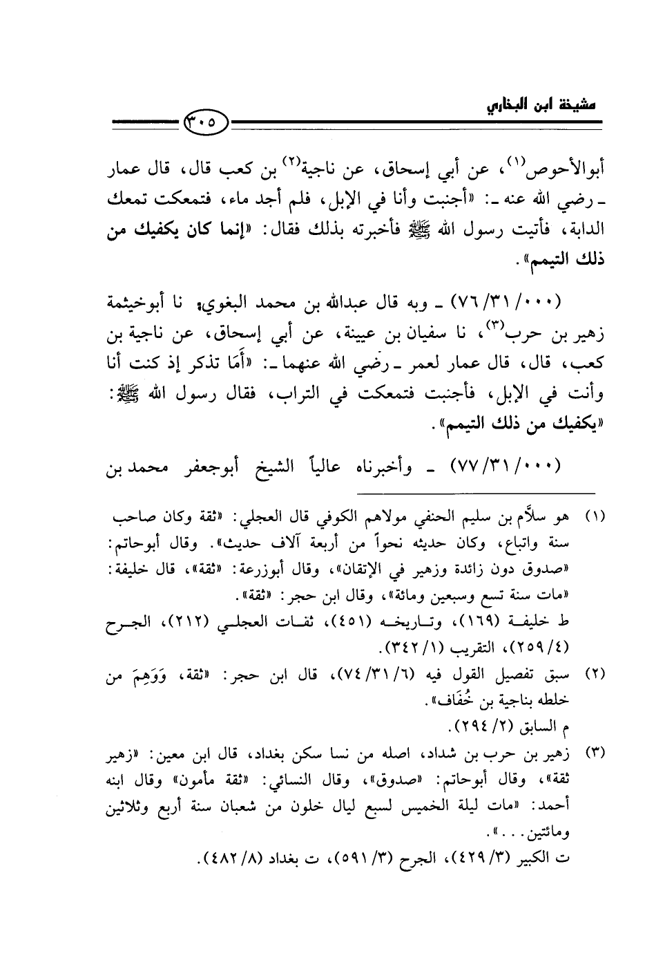 (000 / 31 / 76) - وَبِهِ قَالَ عَبْدُ اللَّهِ بْنُ مُحَمَّدٍ الْبَغَوِيُّ، نَا أَبُو خَيْثَمَةَ زُهَيْرُ بْنُ حَرْبٍ، نَا سُفْيَانُ بْنُ عُيَيْنَةَ، عَنْ أَبِي إِسْحَاقَ، عَنْ نَاجِيَةَ بْنِ كَعْبٍ، قَالَ، قَالَ عَمَّارٌ لِعُمَرَ - رَضِيَ اللَّهُ عَنْهُمَا -: " أَمَا تَذْكُرُ إِذْ كُنْتُ أَنَا وَأَنْتَ فِي الْإِبِلِ، فَأَجْنَبْتُ فتمعكت فِي التُّرَاب، فَقَالَ رَسُول الله - صَلَّى اللَّهُ عَلَيْهِ وَسَلَّم َ -: " يَكْفِيكَ مِنْ ذَلِكَ التَّيَمُّمُ ".