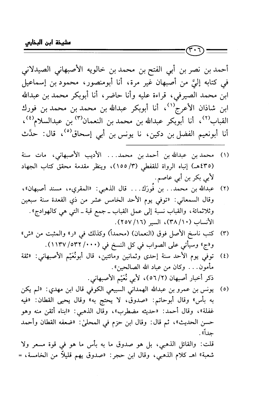 أَحْمَدَ بْنِ نَصْرِ بْنِ أَبِي الْفَتْح بْنِ مُحَمَّدِ بْنِ خَالَوَيْهِ الْأَصْبَهَانِيُّ الصَّيْدَلَانِيُّ فِي كِتَابِهِ إِلَيَّ مِنْ أَصْبَهَانَ غَيْرَ مَرَّةٍ، أَنَا أَبُو مَنْصُور، مَحْمُود بن إِسْمَاعِيل ابْن مُحَمَّدٍ الصَّيْرَفِيُّ، قِرَاءَةً عَلَيْهِ وَأَنَا حَاضِرٌ، أَنَا أَبُو بكر مُحَمَّد بن عبد الله ابْن شَاذَانَ الْأَعْرَجُ، أَنَا أَبُو بَكْرٍ عَبْدُ اللَّهِ بْنُ مُحَمَّدِ بْنِ مُحَمَّدِ بْنِ فُورَكٍ الْقَبَّابُ، أَنَا أَبُو بَكْرٍ عَبْدُ اللَّهِ بْنُ مُحَمَّدِ بْنِ النُّعْمَانِ بْنِ عَبْدِ السَّلامِ، أَنَا أَبُو نُعَيْمٍ الْفَضْلُ بْنُ دُكَيْنٍ، نَا يُونُسُ بْنُ أَبِي إِسْحَاقَ، قَالَ: حَدَّثَ