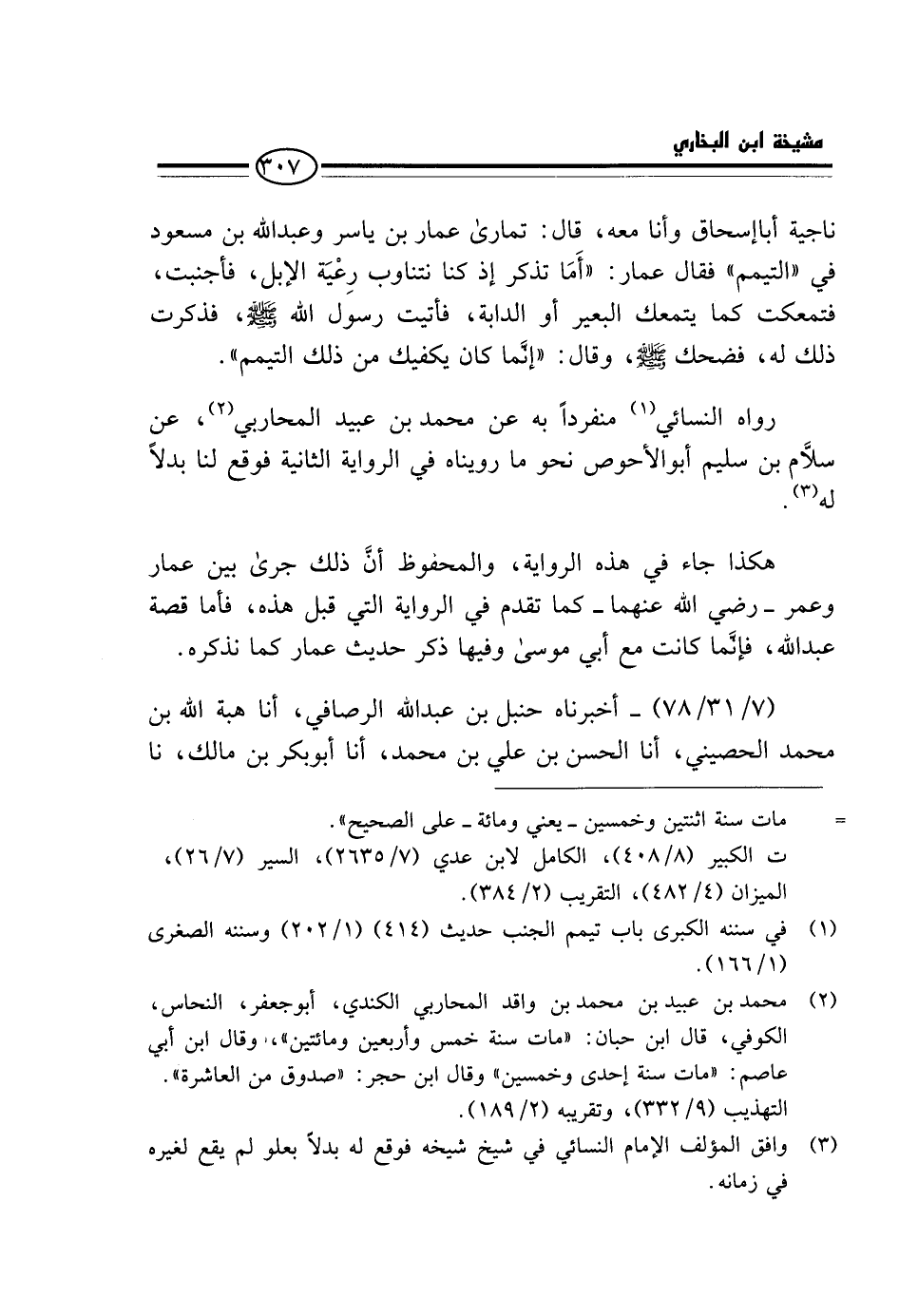 رَوَاهُ النَّسَائِيُّ مُنْفَرِدًا بِهِ عَنْ مُحَمَّدِ بْنِ عُبَيْدٍ الْمُحَارِبِيِّ، عَنْ سَلامِ بْنِ سُلَيْمٍ أَبُو الْأَحْوَصِ نَحْوَ مَا رَوَيْنَاهُ فِي الرِّوَايَةِ الثَّانِيَةِ فَوَقَعَ لَنَا بَدَلًا لَهُ.