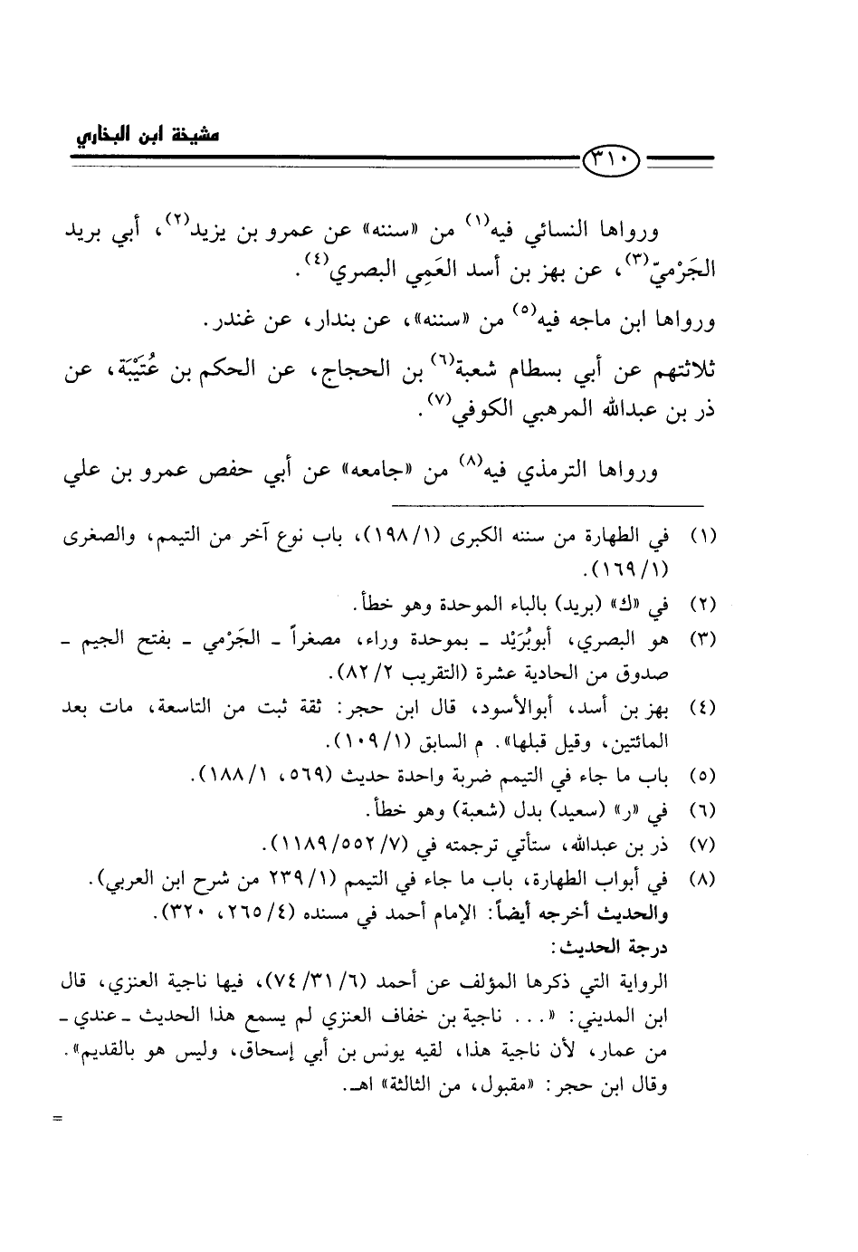 وَرَوَاهَا النَّسَائِيُّ فِيهِ مِنْ " سُنَنِهِ " عَنْ عَمْرِو بن يزِيد، أَبِي بُرَيْدٍ الْجَرْمِيِّ، عَنْ بَهْزِ بْنِ أَسَدٍ الْعَمِّيِّ الْبَصْرِيِّ. وَرَوَاهَا ابْنُ مَاجَهْ فِيهِ مِنْ " سُنَنِهِ " عَنْ بُنْدَارٍ، عَنْ غُنْدَرٍ. ثَلَاثَتُهُمْ عَنْ أَبِي بِسْطَامٍ شُعْبَةَ بْنِ الْحَجَّاجِ، عَنِ الْحَكَمِ بْنِ عُتَيْبَةَ، عَنْ ذَرِّ بْنِ عَبْدِ اللَّهِ الْمُرْهِبِيِّ الْكُوفِيِّ.