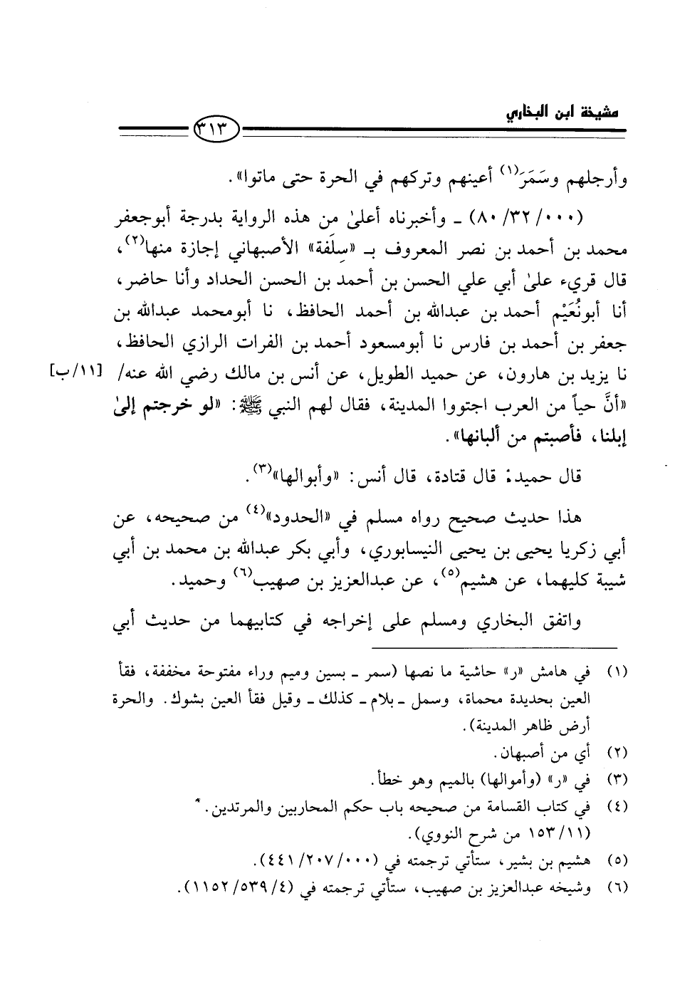 (000 / 32 / 80) - وَأَخْبَرَنَاهُ أَعْلَى مِنْ هَذِهِ الرِّوَايَةِ بِدَرَجَةٍ أَبُو جَعْفَرٍ مُحَمَّدُ بْنُ أَحْمَدَ بْنِ نَصْرِ الْمَعْرُوف ب " سلفة " الْأَصْبَهَانِيّ إجَازَة مِنْهَا، قَالَ قريء عَلَى أَبِي عَلِيٍّ الْحَسَنِ بْنِ أَحْمَدَ بْنِ الْحَسَنِ الْحَدَّادِ وَأَنَا حَاضِرٌ، أَنَا أَبُو نُعَيْمٍ أَحْمَدُ بْنُ عَبْدِ اللَّهِ بْنِ أَحْمَدَ الْحَافِظُ، نَا أَبُو مُحَمَّدٍ عَبْدُ اللَّهِ بْنُ جَعْفَرِ بْنِ أَحْمَدَ بْنِ فَارِسَ نَا أَبُو مَسْعُودٍ أَحْمَدُ بْنُ الْفُرَاتِ الرَّازِيُّ الْحَافِظُ، نَا يَزِيدُ بْنُ هَارُونَ، عَنْ حُمَيْدٍ الطَّوِيلِ، عَنْ أَنَسِ بْنِ مَالِكٍ رَضِيَ اللَّهُ عَنْهُ / " أَنَّ حَيًّا مِنَ الْعَرَبِ اجْتَوَوُا الْمَدِينَةَ، فَقَالَ لَهُمْ النَّبِيُّ - صَلَّى اللَّهُ عَلَيْهِ وَسَلَّم َ -: " لَوْ خَرَجْتُمْ إِلَى إِبِلِنَا، فَأَصَبْتُمْ مِنْ أَلْبَانِهَا ".