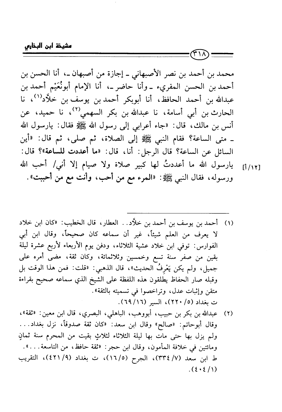 مُحَمَّدُ بْنُ أَحْمَدَ بْنِ نَصْرٍ الْأَصْبَهَانِيُّ - إِجَازَةً مِنْ أَصْبَهَانَ -، أَنَا الْحَسَنُ بْنُ أَحْمَدَ بْنِ الْحسن المقريء - وَأَنَا حَاضِرٌ -، أَنَا الْإِمَامُ أَبُو نُعَيْمٍ أَحْمَدُ بْنُ عَبْدِ اللَّهِ بْنِ أَحْمَدَ الْحَافِظُ، أَنَا أَبُو بَكْرٍ أَحْمَدُ بْنُ يُوسُفَ بْنِ خَلادٍ، نَا الْحَارِثُ بْنُ أَبِي أُسَامَةَ، نَا عَبْدُ اللَّهِ بْنُ بَكْرٍ السَّهْمِيُّ، نَا حُمَيْدٌ، عَنْ أَنَسِ بْنِ مَالِكٍ، قَالَ: " جَاءَ أَعْرَابِيٌّ إِلَى رَسُول الله - صَلَّى اللَّهُ عَلَيْهِ وَسَلَّم َ - فَقَالَ: يَا رَسُولَ اللَّهِ - مَتَى السَّاعَةُ؟ فَقَامَ النَّبِي - صَلَّى اللَّهُ عَلَيْهِ وَسَلَّم َ - إِلَى الصَّلَاةِ، ثُمَّ صَلَّى، ثُمَّ قَالَ: " أَيْنَ السَّائِلُ عَنِ السَّاعَةِ؟ قَالَ الرَّجُلُ: أَنَا، قَالَ: " مَا أَعْدَدْتَ لِلسَّاعَةِ "؟ قَالَ: يَا رَسُولَ اللَّهِ مَا أَعْدَدْتُ لَهَا كَبِيرَ صَلَاةٍ وَلَا صِيَامٍ إِلَّا أَنِّي / أُحِبُّ اللَّهَ وَرَسُولَهُ، فَقَالَ النَّبِيُّ - صَلَّى اللَّهُ عَلَيْهِ وَسَلَّم َ -: " الْمَرْءُ مَعَ مَنْ أَحَبَّ، وَأَنْتَ مَعَ مَنْ أَحْبَبْت ".
